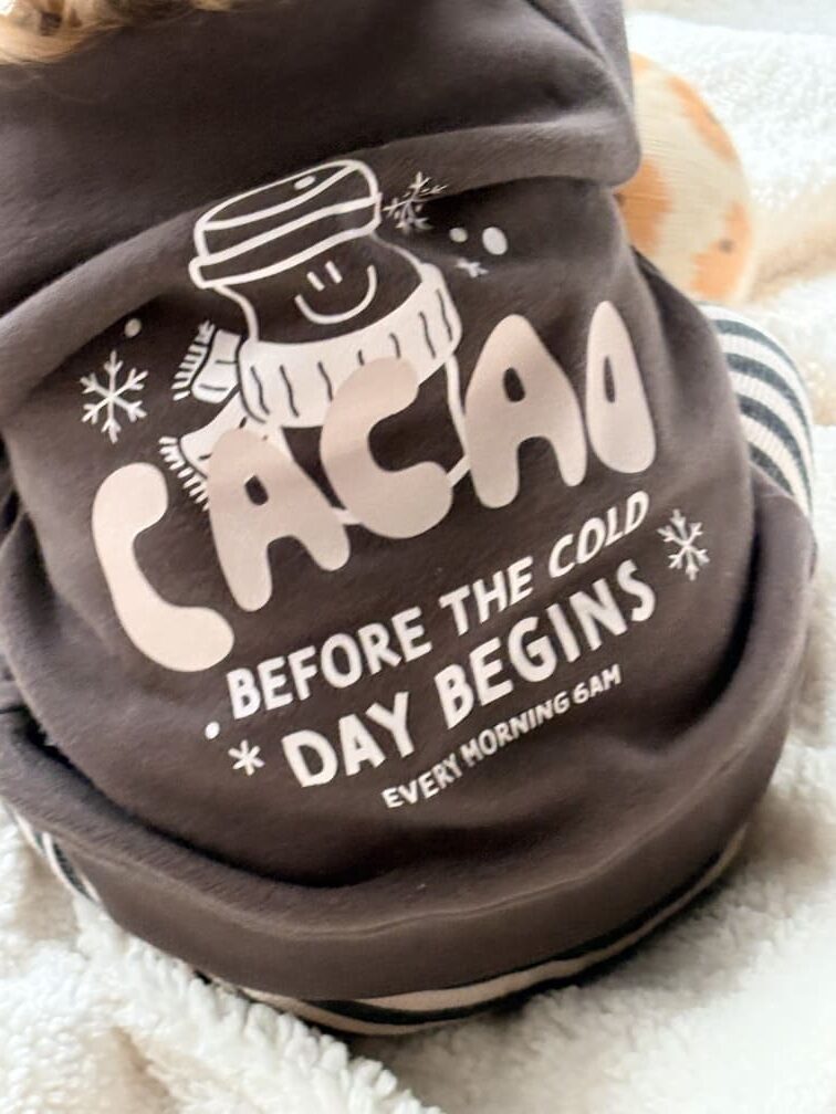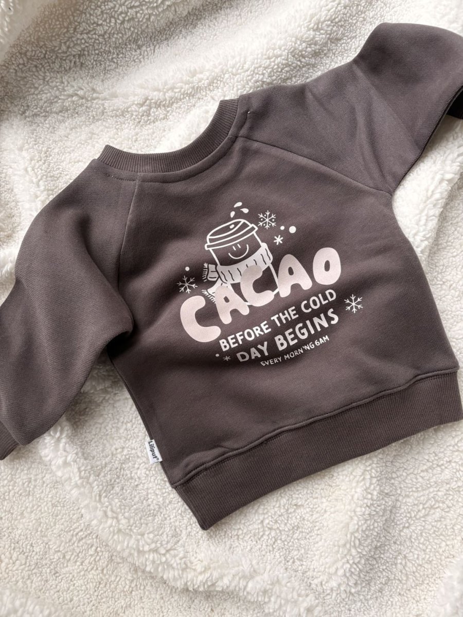 Ce sweat hiver pour bébé et enfant convient parfaitement pour toutes les aventures du quotidien ! Super doux, confortable, il est aussi très tendance avec son imprimé « Cacao », un clin d’oeil aux matins pressés ! Grâce à ses boutons-pression pratiques et cachés (jusqu’à la taille 86/92), le sweat est très facile à enfiler – sans stress.