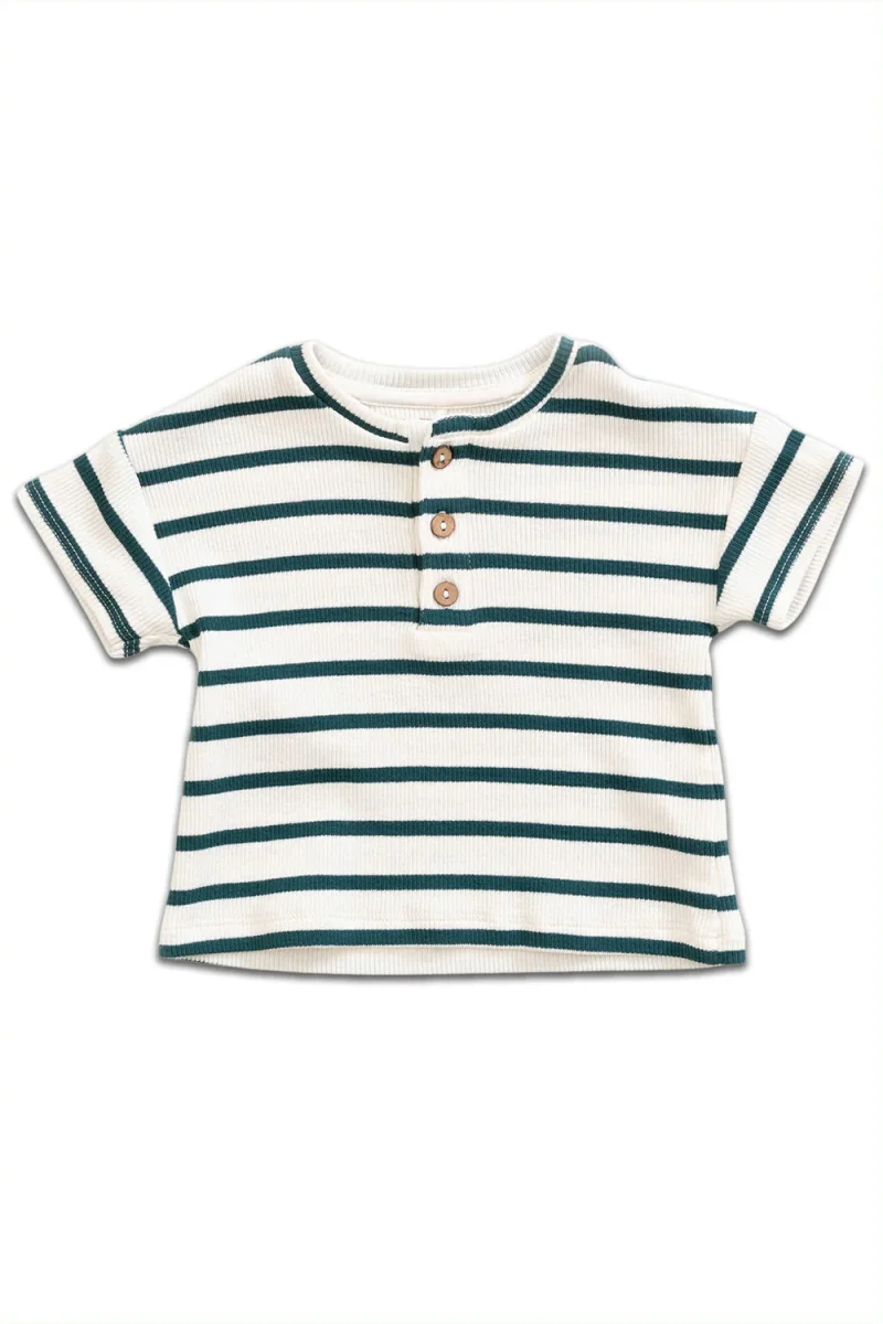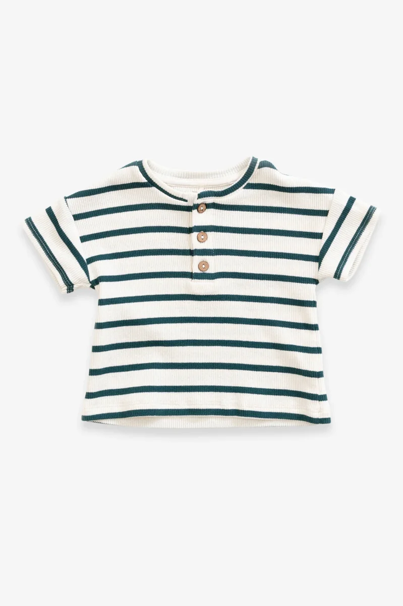 Ce t-shirt en coton biologique est un modèle à manches courtes qui possède une patte de boutonnage sur le devant avec trois boutons en écorce de noix de coco.