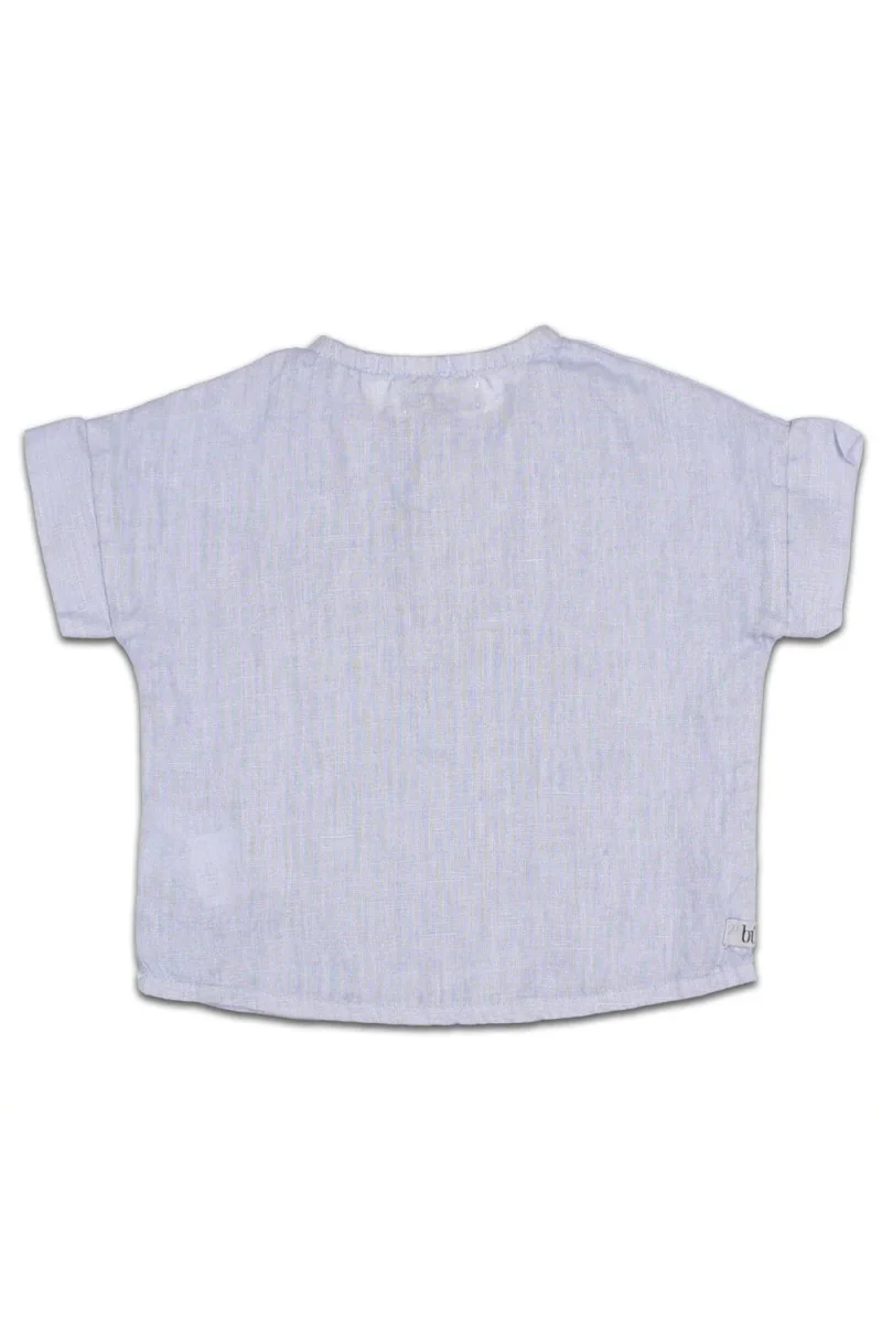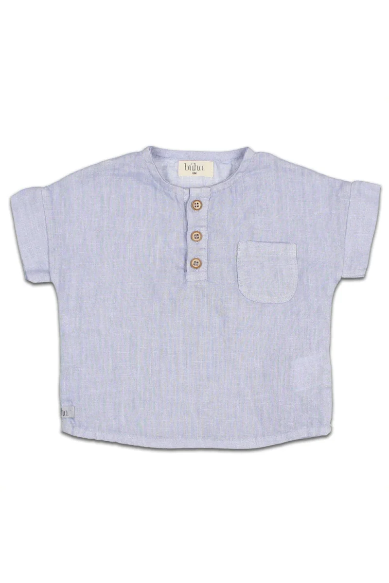 Chemise en lin à manches courtes. Encolure ronde. Fermeture par patte à trois boutons sur le devant. Poche plaquée devant à gauche.
