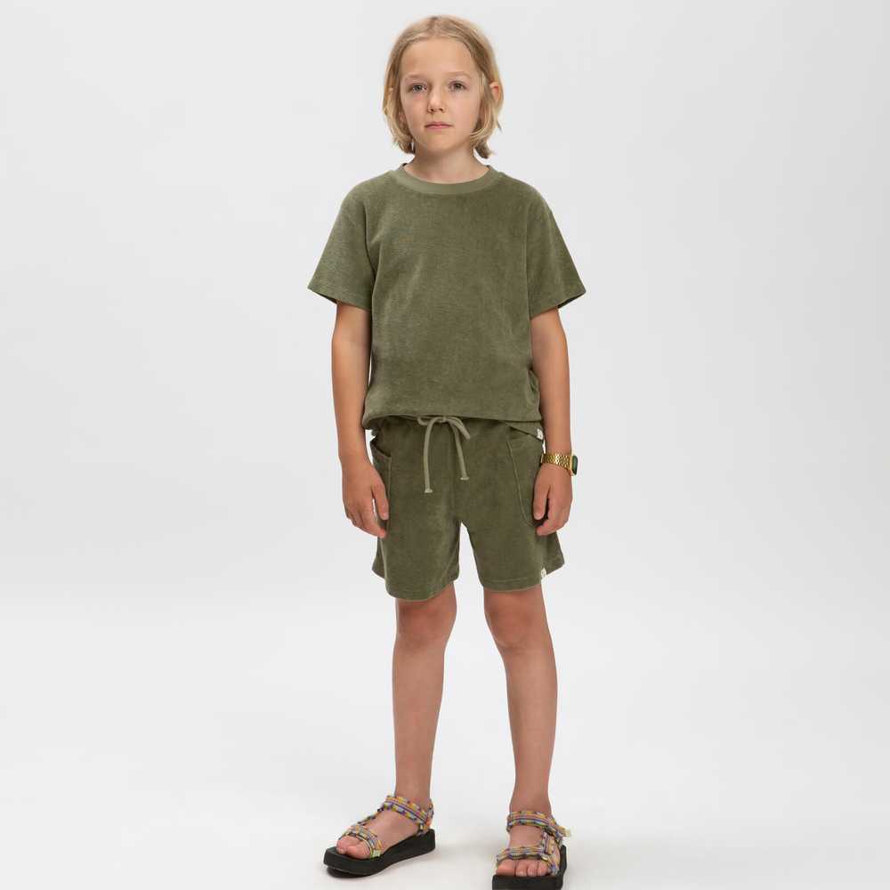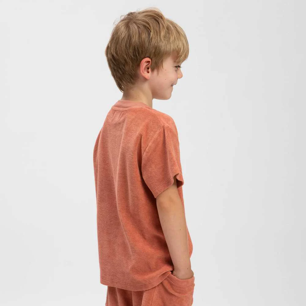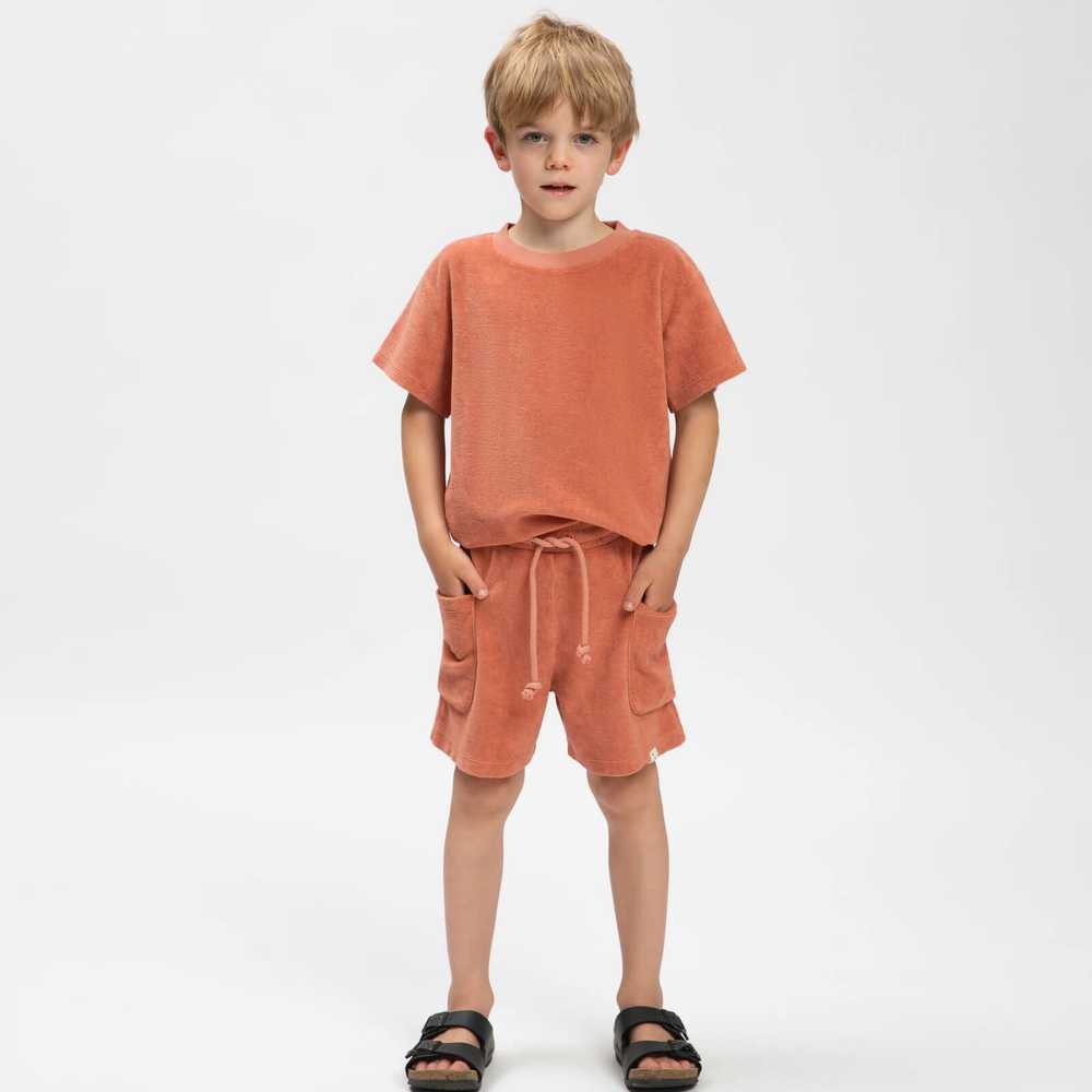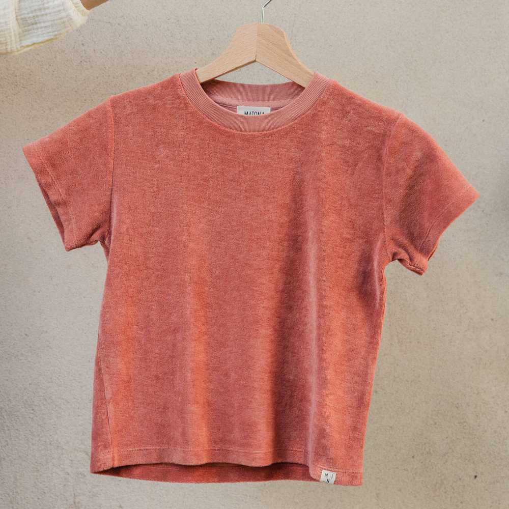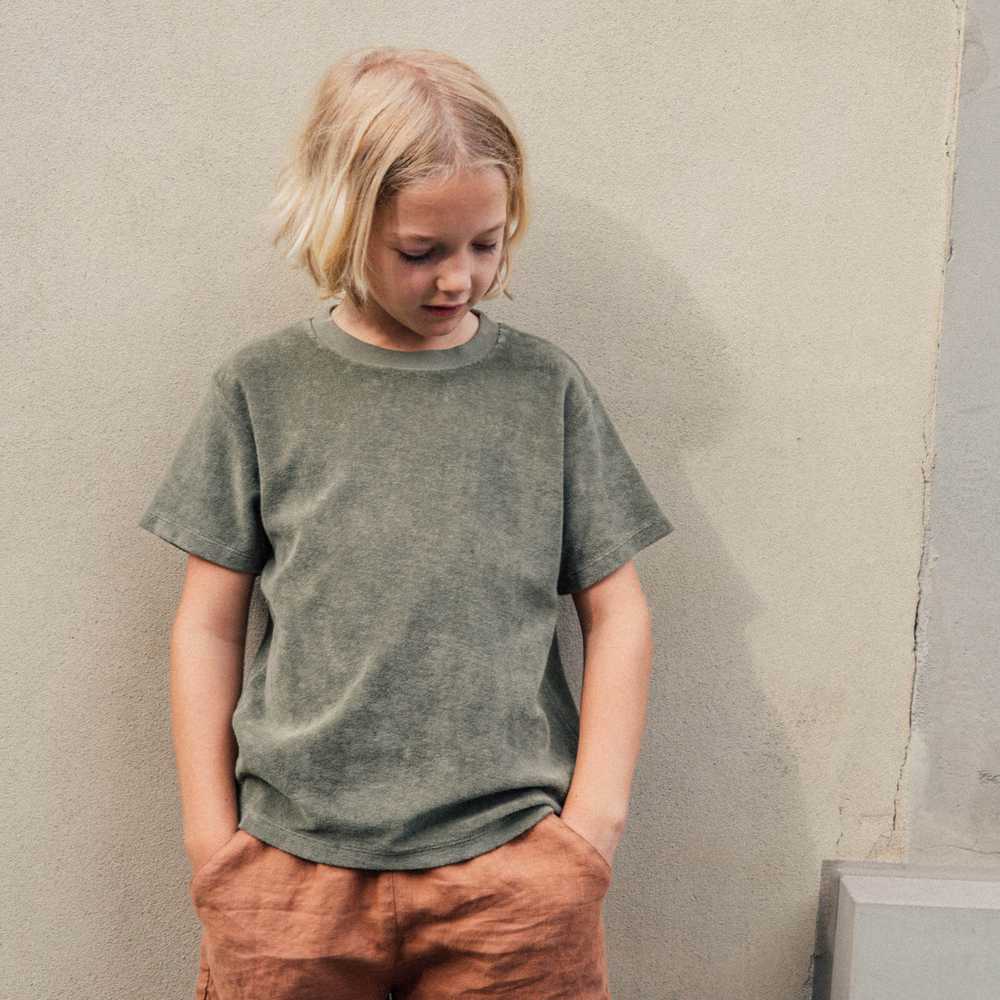 T-shirt en éponge de coton bio pour enfant de la marque autrichienne Matona : un bon basique mixte, durable et confortable, avec manches courtes, à assortir au short en éponge pour un super pyjama d’été !
