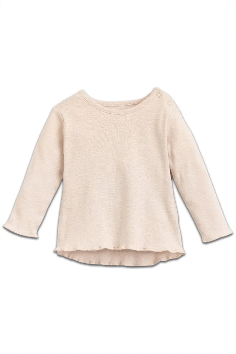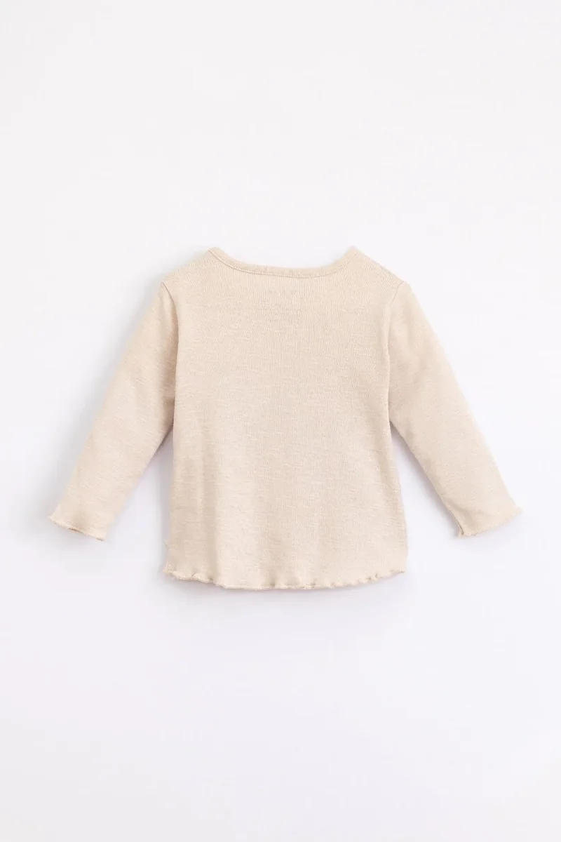 Ce T-shirt est fabriqué en coton biologique à points de jersey. Le modèle a des manches longues, un col rond et une ouverture sur l’épaule avec des boutons pressions conçus sans nickel.