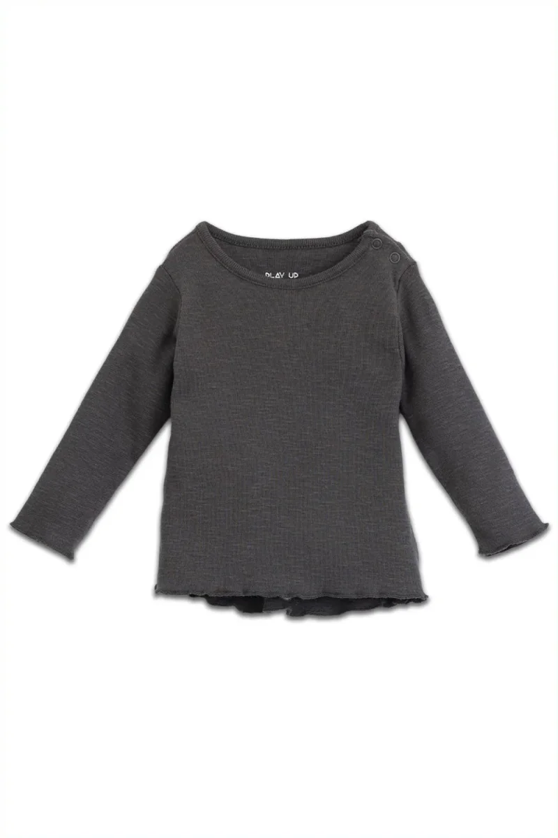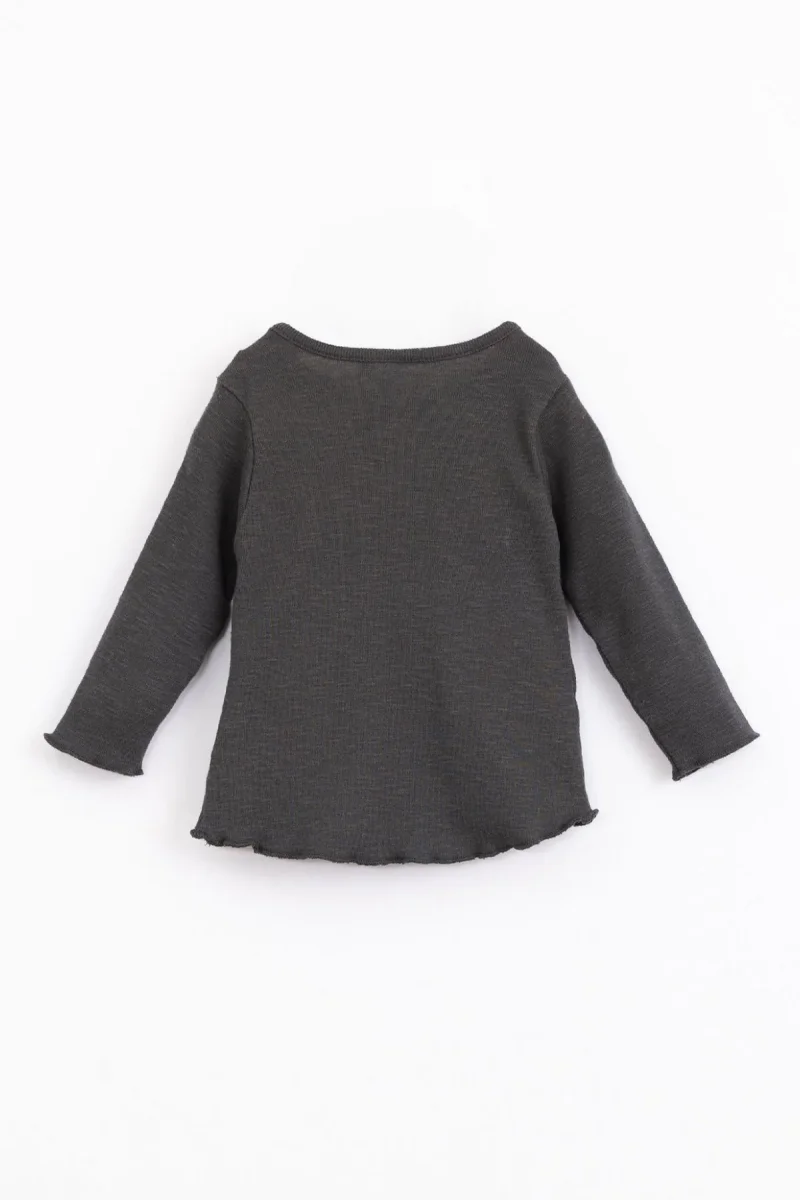 Ce T-shirt est fabriqué en coton biologique à points de jersey. Le modèle a des manches longues, un col rond et une ouverture sur l’épaule avec des boutons pressions conçus sans nickel.
