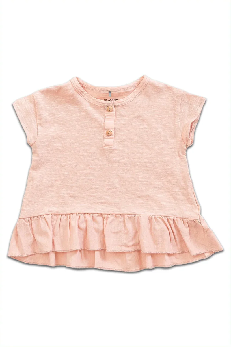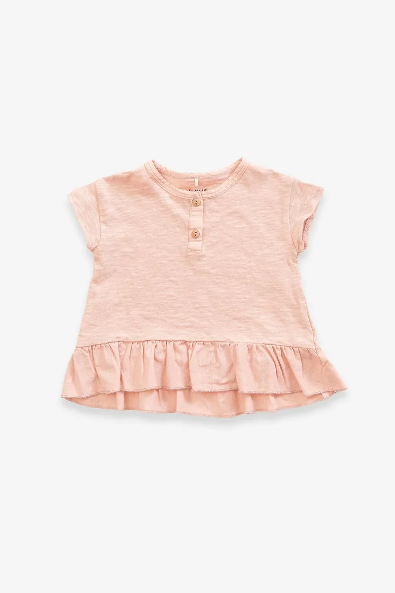Ce t-shirt en coton biologique est un modèle à manches courtes avec une encolure ronde, une ouverture sur le devant avec deux boutons en bois léger et un volant en coton biologique.