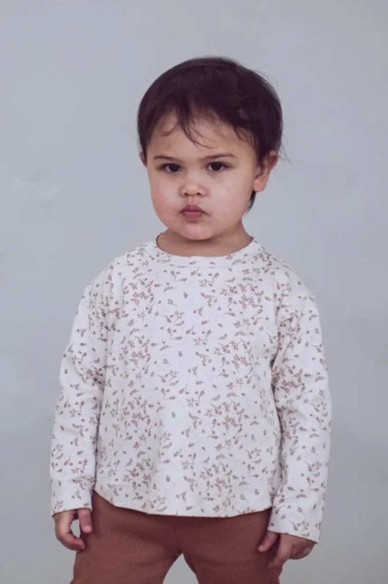 Manches longues, Bas arrondi, Imprimé petites feuilles cannelle