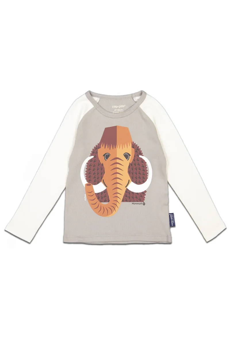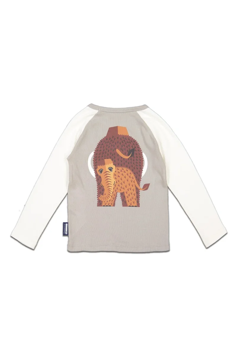 T-shirt gris et blanc à manches longues, au col rond, en coton biologique. Ce t-shirt bébé avec un imprimé Mammouth recto-verso, fera craquer petits en grands !