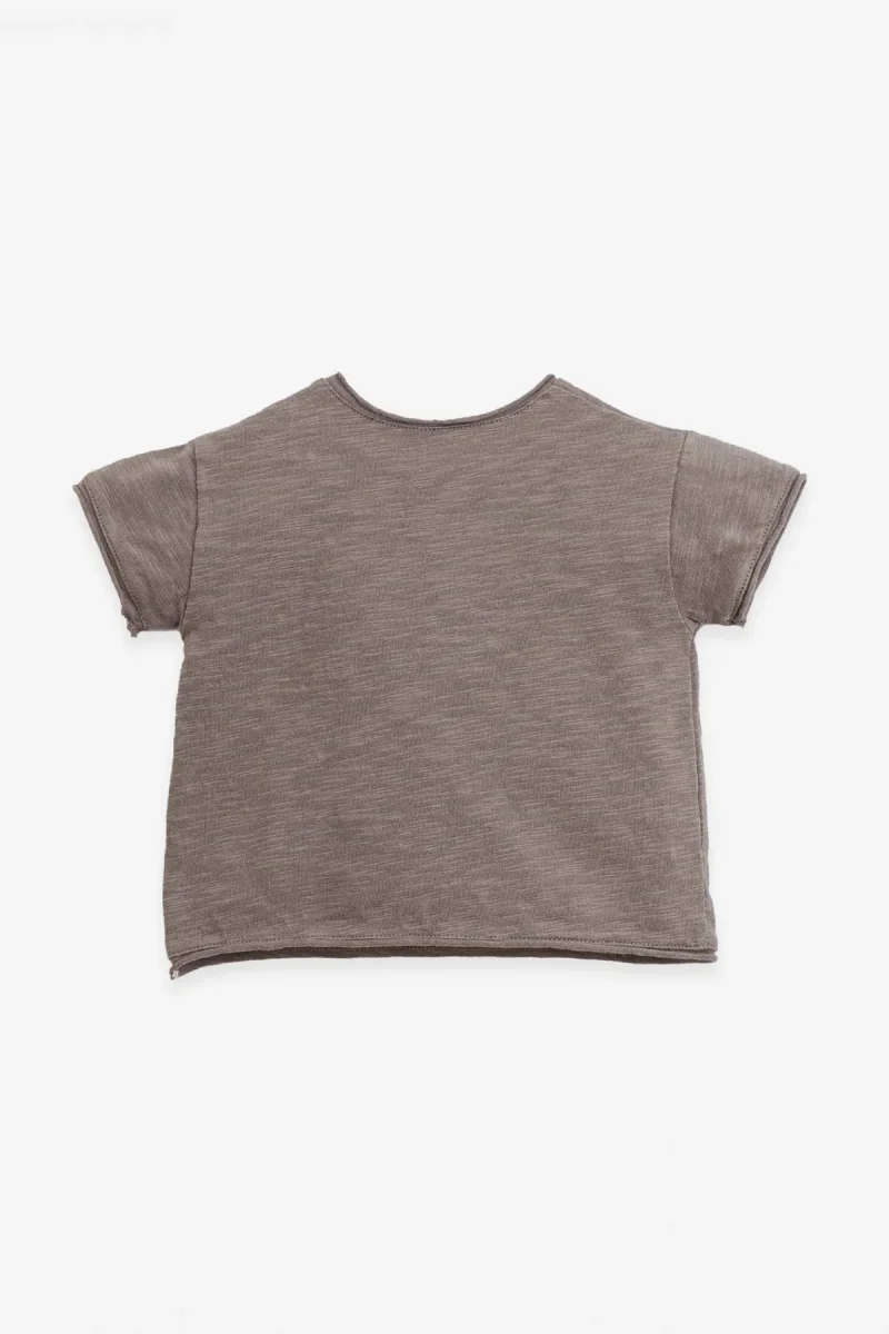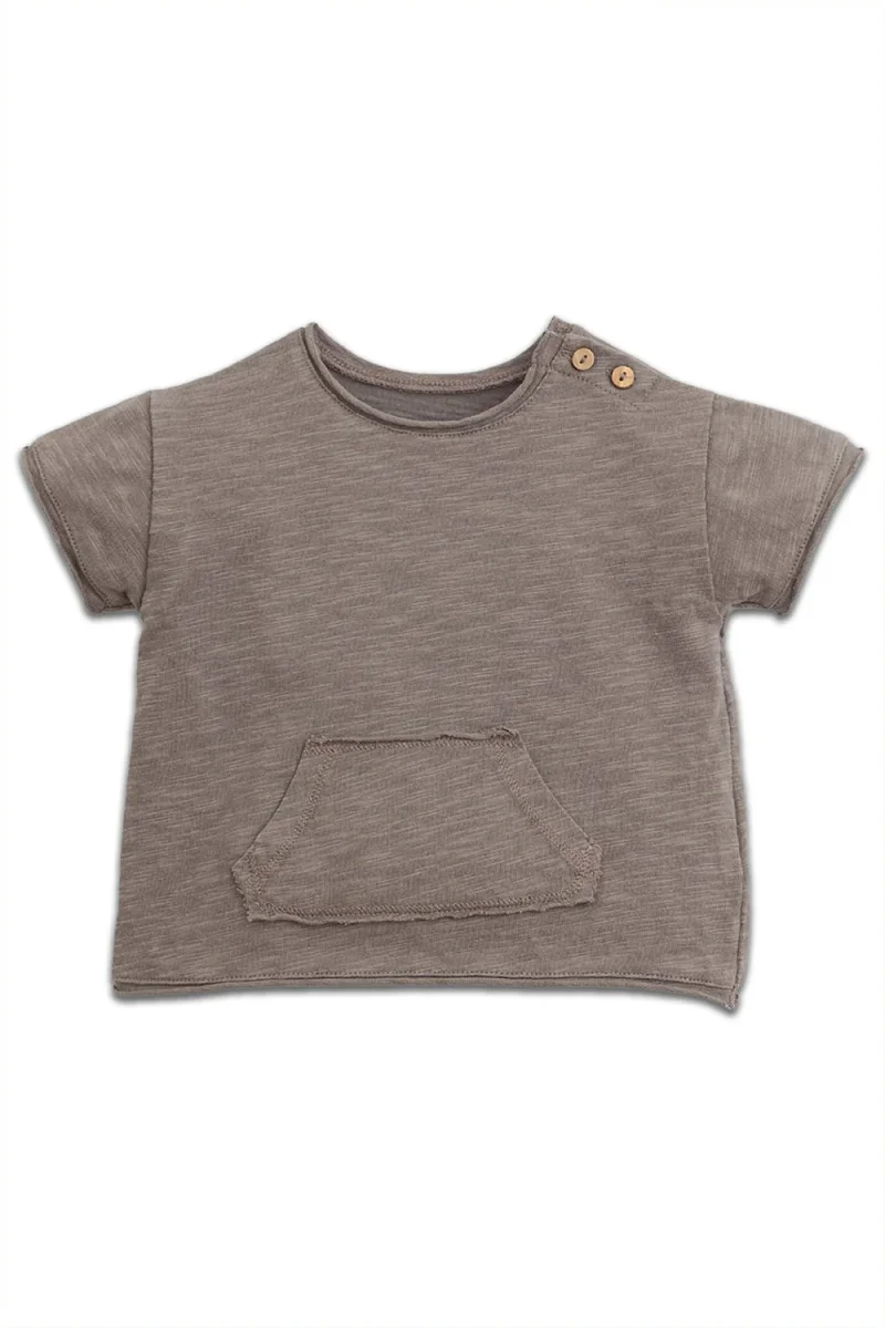 Ce tee-shirt en coton biologique avec des coutures en jersey est un modèle à manches courtes et au col rond. Il possède une poche sur le devant et une ouverture sur l’épaule avec des petits boutons en bois. Toutes les matières premières utilisées dans ce vêtement sont certifiées Standard 100 par OEKO-TEX, il est donc totalement exempt de substances nocives pour la peau des enfants.