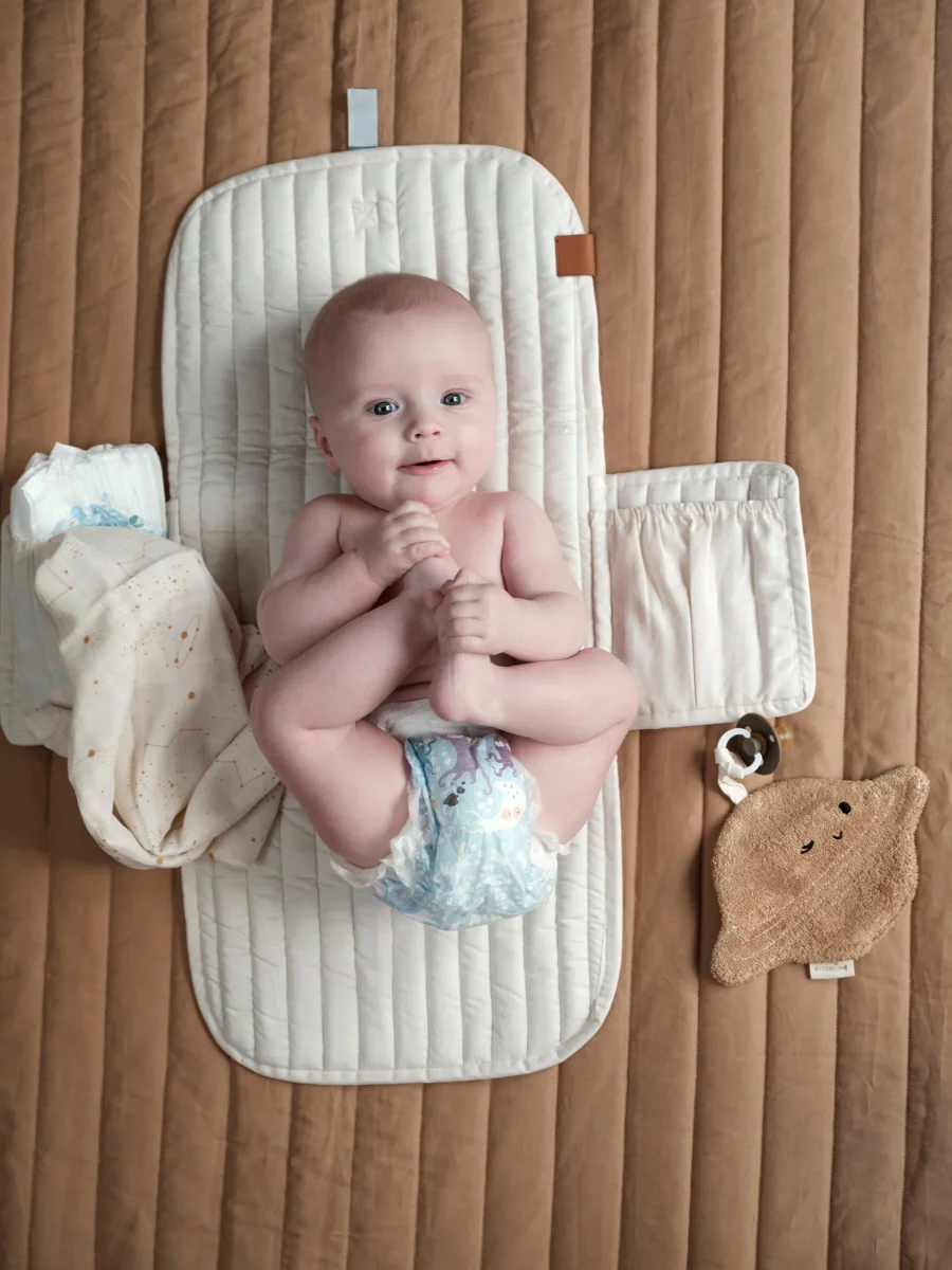 Le matelas à langer matelassé à emporter de Fabelab est très joli et pratique. Il contient deux poches intérieures pour ranger le nécessaire pour le change et se ferme facilement avec du velcro. Le matelas à langer se glisse parfaitement dans votre sac à langer lorsque vous devez l’emporter avec vous. Il est fabriqué en coton 100 % biologique et garni de polyester recyclé.