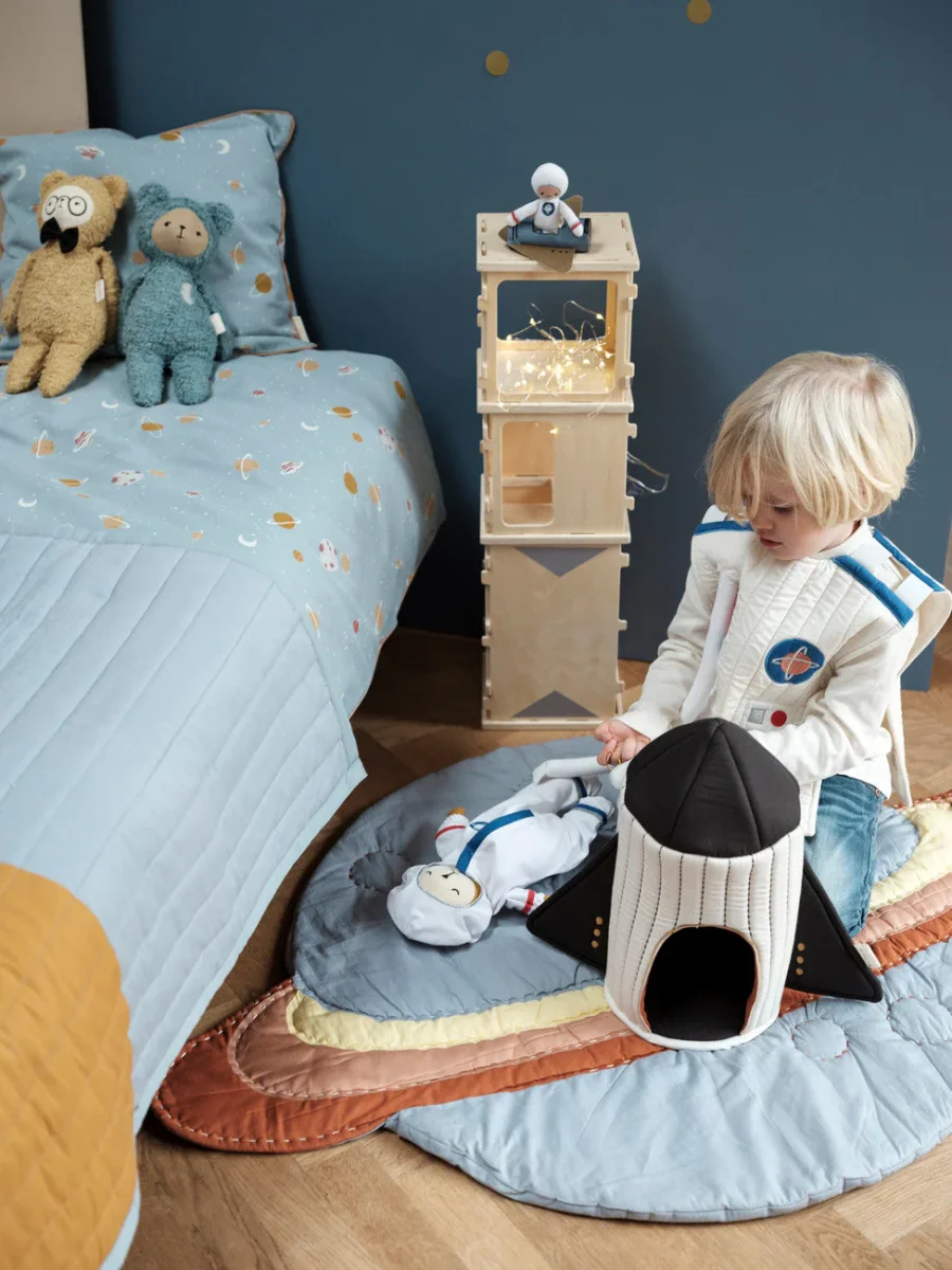 Le tapis matelassé Planète va faire voyager la chambre de Bébé. Utilisez-la comme un tapis, une couverture douce pour bébé, une couverture de lit décorative, ou accrochez-la au mur comme une décoration. La couverture est d’ailleurs livrée avec des boucles pratiques pour la suspendre.