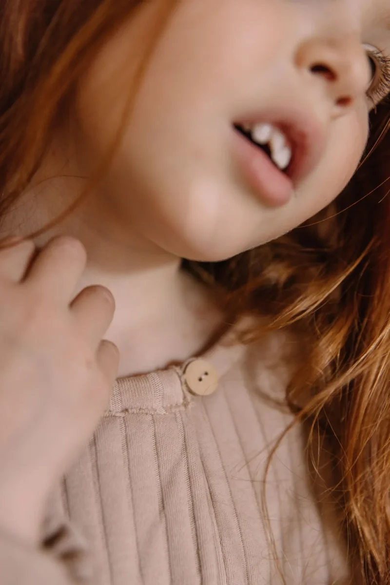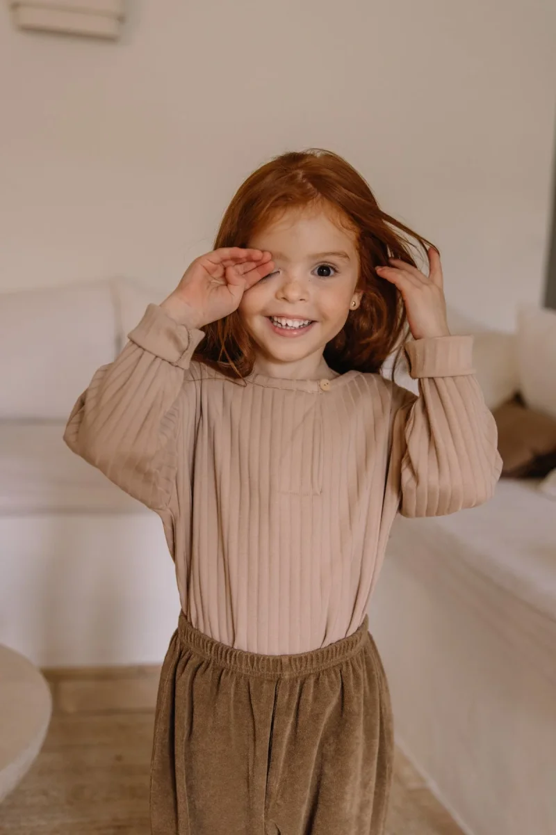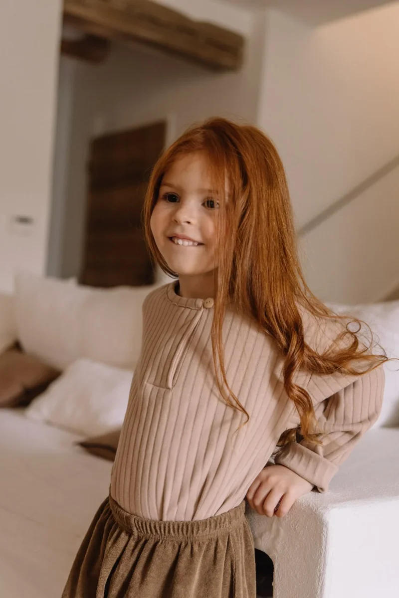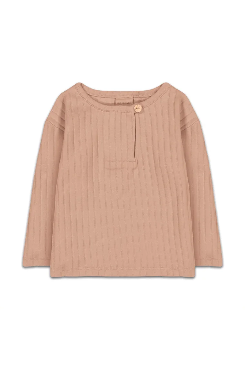 T-shirt mixte à manches longues en jersey côtelé 100% coton biologique. Ouverture sur le devant avec un bouton en bois.