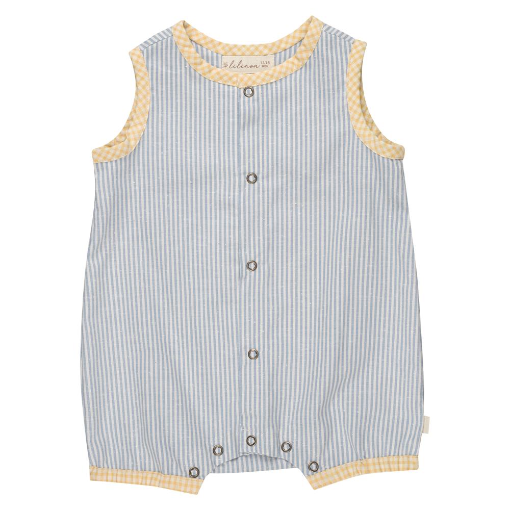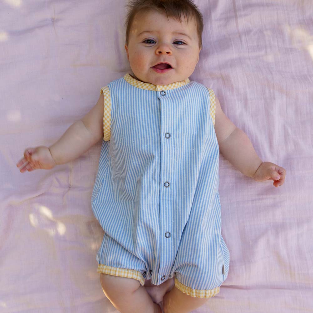 Combinaison 100% coton, boutonnée sur le devant, préssions à l’entre jambes, petit biais vichy jaune au niveau des emmanchures et des jambes