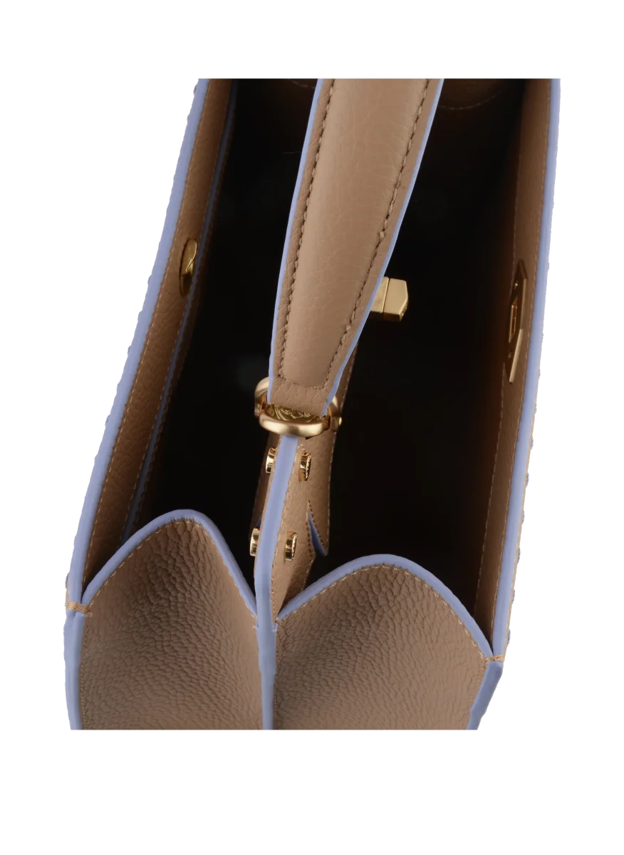 Pour une sécurité optimale, le sac est doté d’un fermoir en métal doré à l’avant, et son fond renforcé avec des pieds en métal protège le cuir des surfaces. Avec ses deux grands compartiments facilement accessibles, à l’avant et à l’arrière, le Trianon Bicolore est idéal pour une utilisation quotidienne ou pour des événements spéciaux.