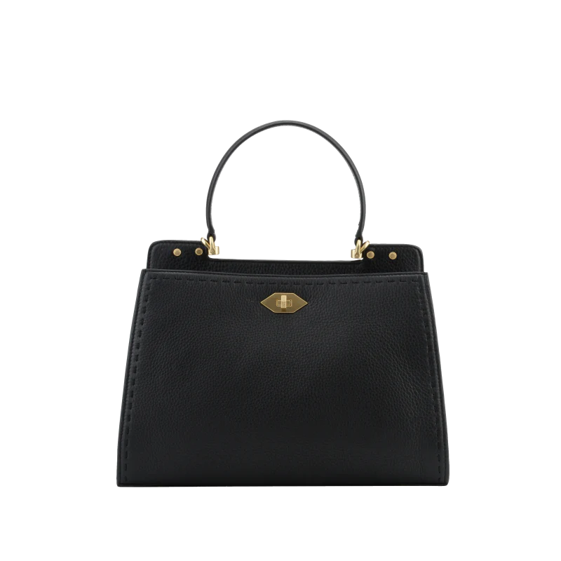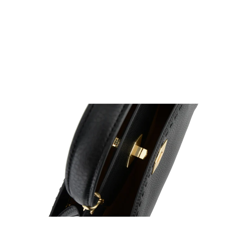 Le sac est équipé d’une anse supérieure rigide pour un port à la main élégant, ainsi qu’une bandoulière amovible et réglable pour un port épaule ou croisé, offrant ainsi une polyvalence appréciable. Les détails en métal doré, tels que le fermoir distinctif et les rivets, apportent une touche de luxe à l’ensemble.