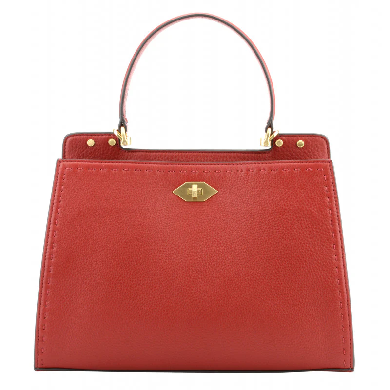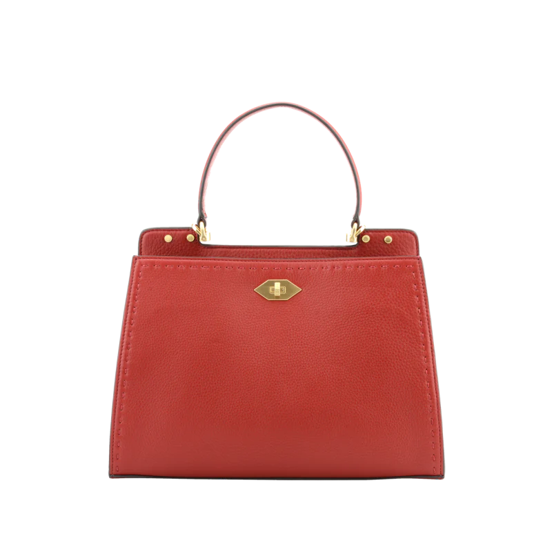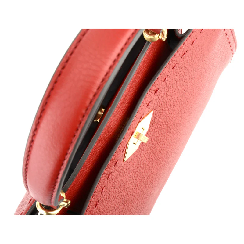 Les détails raffinés, tels que les rivets dorés et les coutures visibles, soulignent le savoir-faire artisanal de ce modèle. La fermeture est ornée d’un fermoir en métal doré, apportant une touche de sophistication supplémentaire. Le logo de la marque est discrètement intégré, ajoutant une note d’élégance sans ostentation.