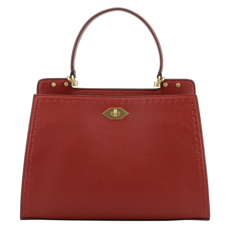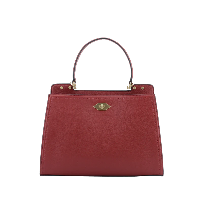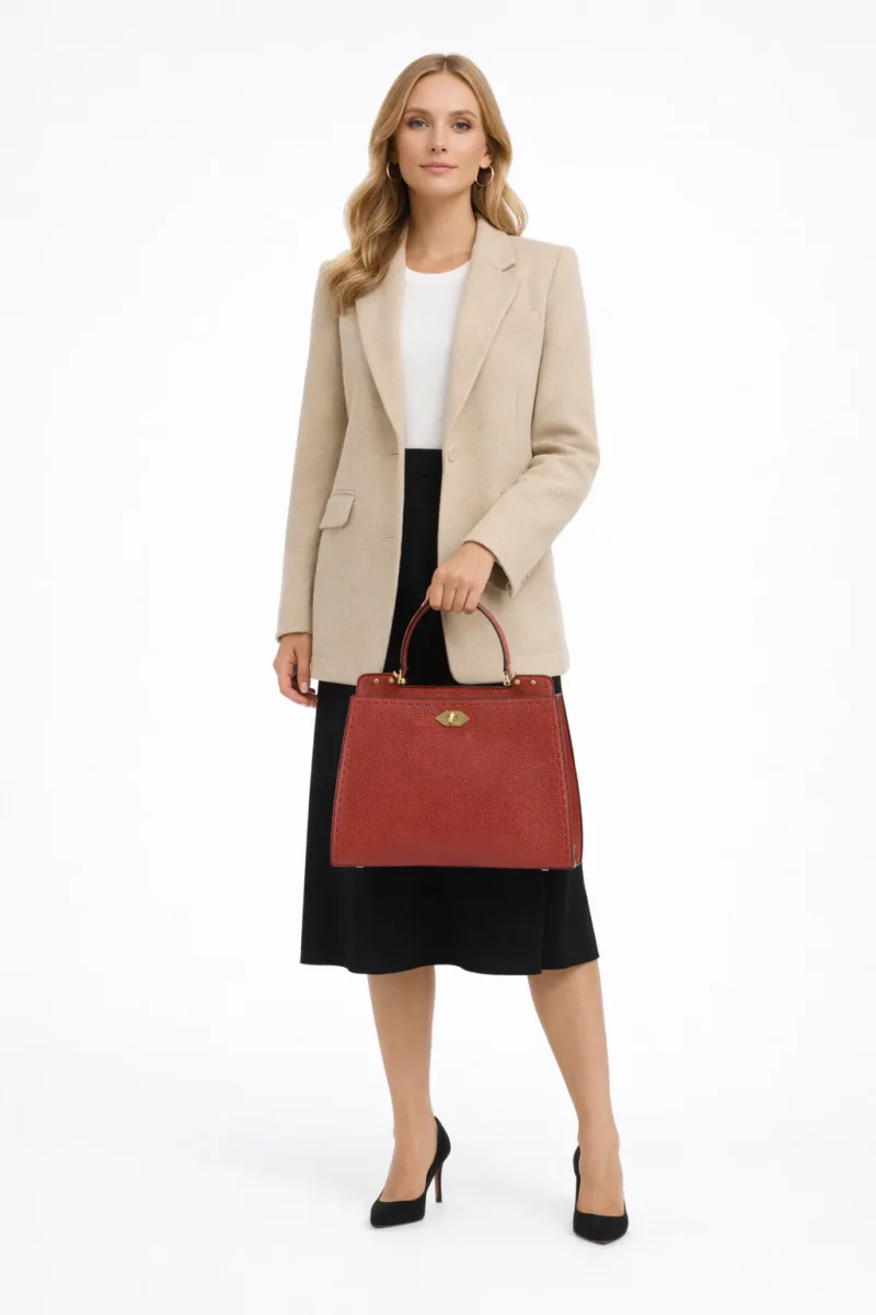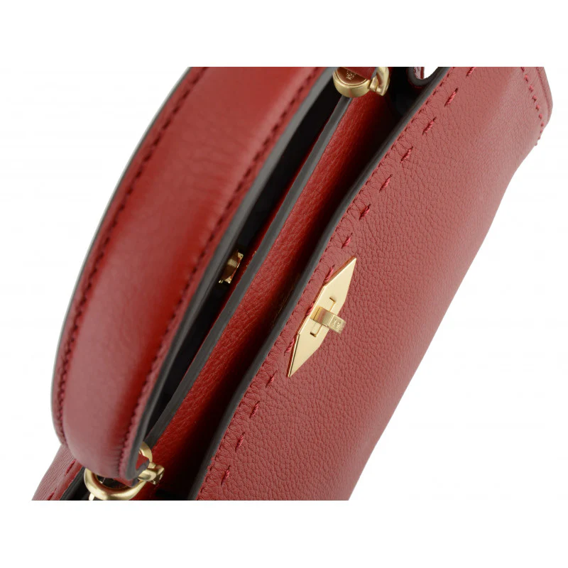 - Fermeture : Sécurisée par un fermoir en métal doré, contrastant élégamment avec le rouge du cuir.