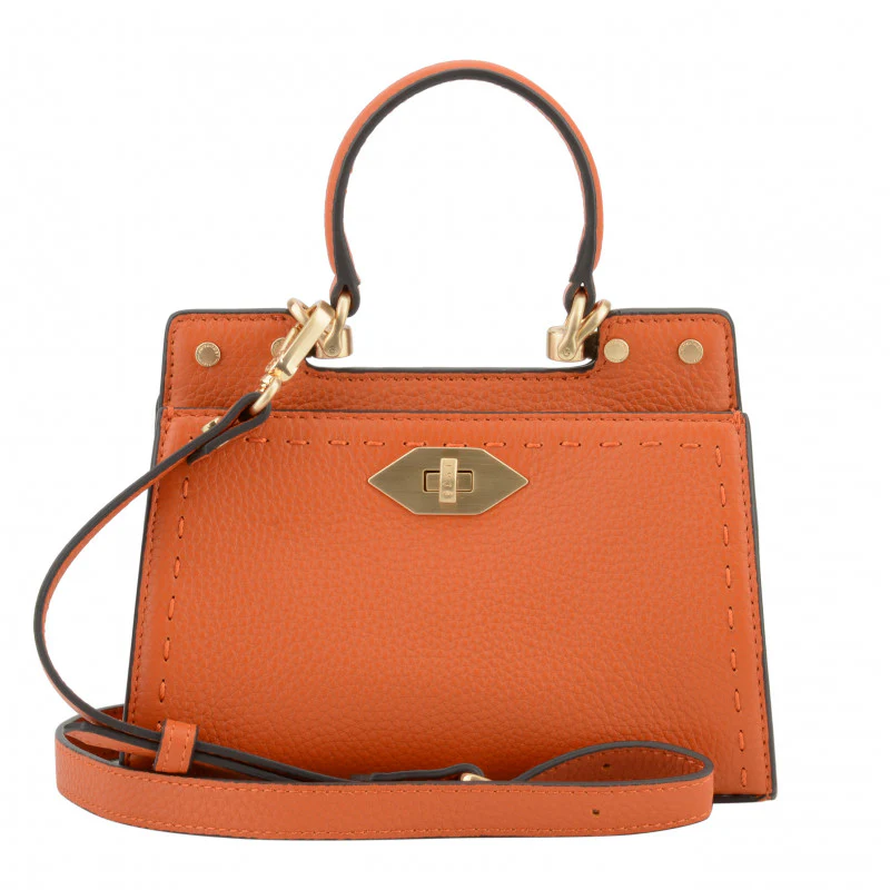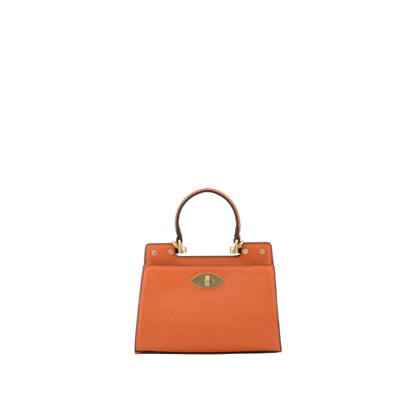 Fabriqué en cuir de vachette, ce sac offre une texture luxueuse et une durabilité exceptionnelle. Sa couleur orange vif attire le regard, tandis que les accents en métal doré, notamment sur la fermeture et les rivets, ajoutent une touche de sophistication.