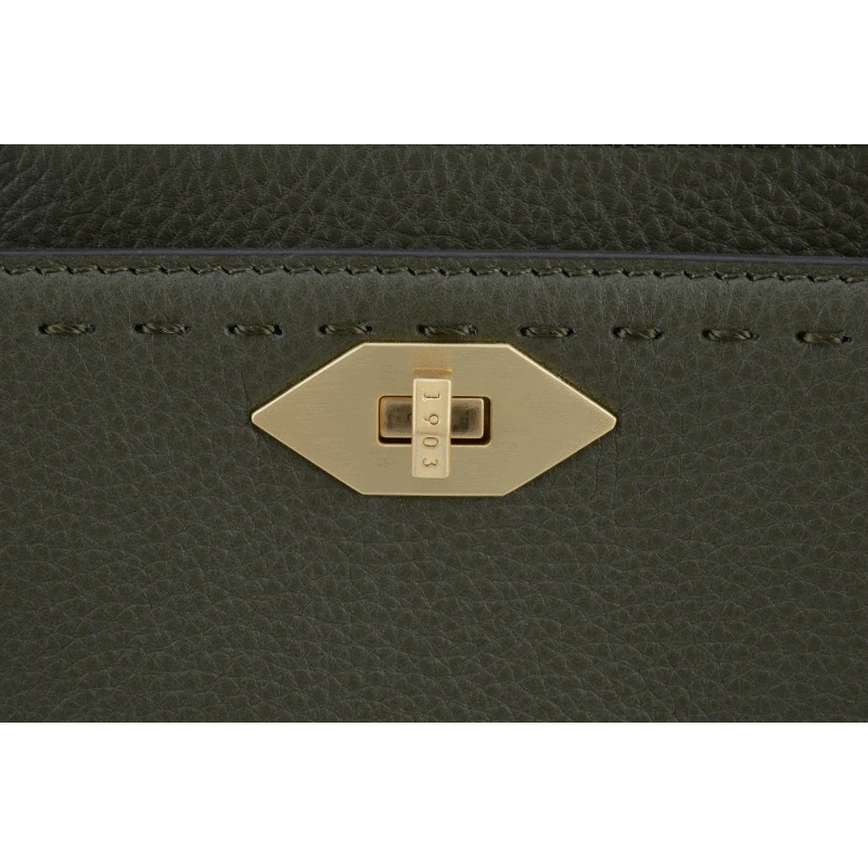 Le Trianon est conçu avec des détails raffinés, notamment des finitions dorées sur les fermoirs et rivets, ajoutant une touche de sophistication. Le logo en métal sur le devant souligne l’identité de la marque, tandis que les coutures visibles apportent un élément de design distinctif.