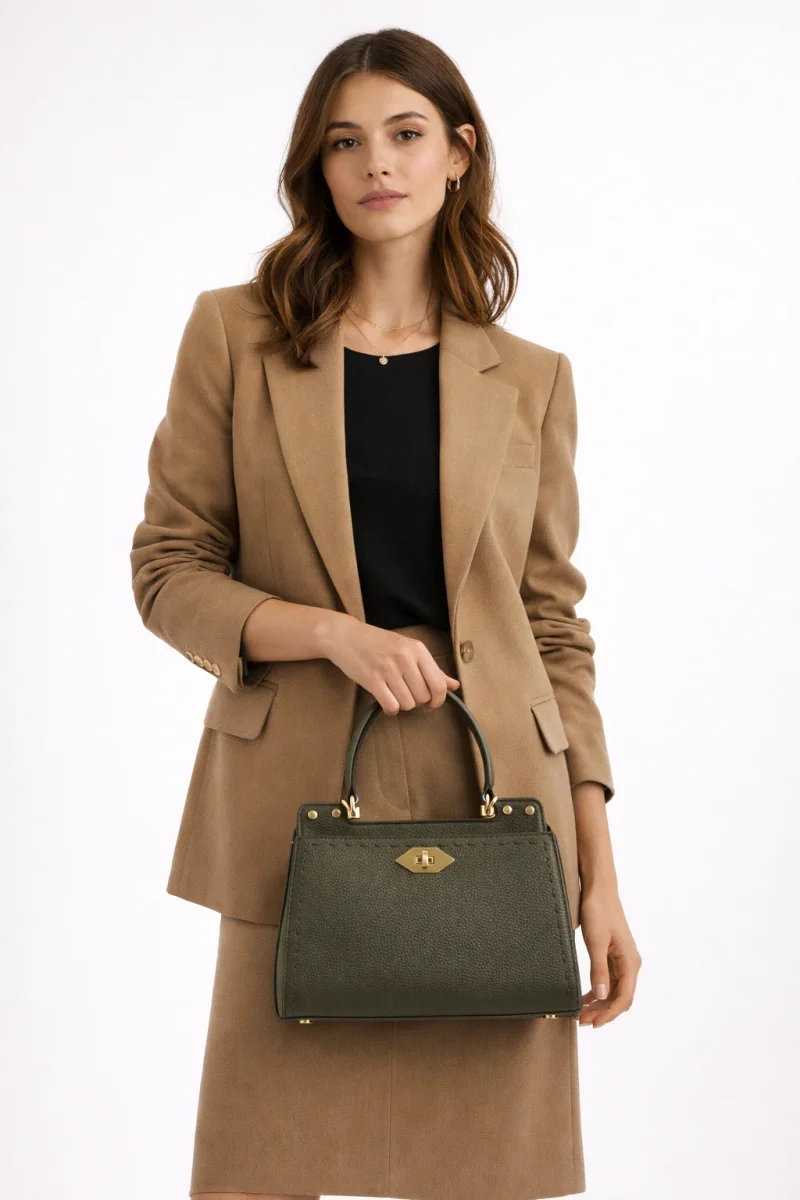 Avec sa forme structurée et ses lignes nettes, ce sac arbore un design moderne. Il est équipé d’une anse courte pour un port à la main, ainsi qu’une bandoulière amovible et réglable pour un port épaule ou croisé, s’adaptant ainsi à vos préférences.