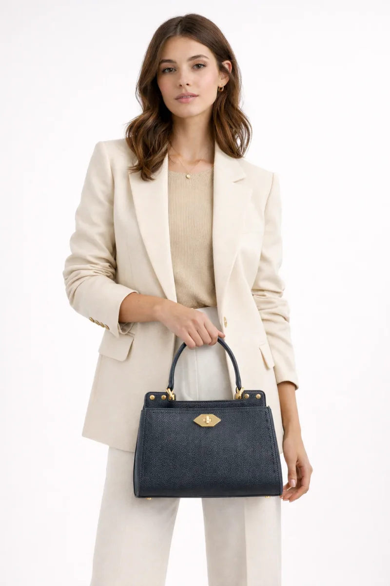 Fabriqué en cuir de vachette texturé, ce sac présente une finition raffinée et une bonne résistance à l’usure. Les détails en métal doré, notamment le fermoir en forme de losange, ajoutent une touche de luxe à son design.