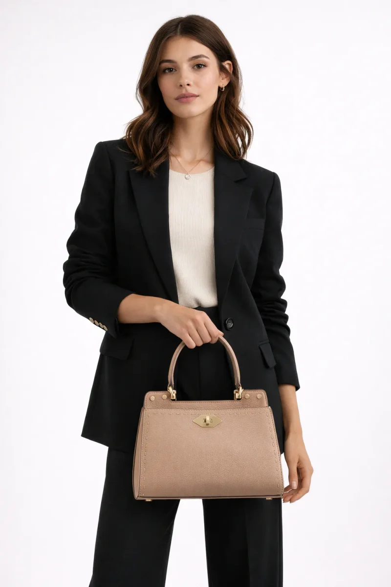 Les détails métalliques en doré, tels que le fermoir en forme de losange et les rivets, ajoutent une touche de luxe à l’ensemble. Ce sac est non seulement fonctionnel, mais il se distingue également par son esthétique raffinée.