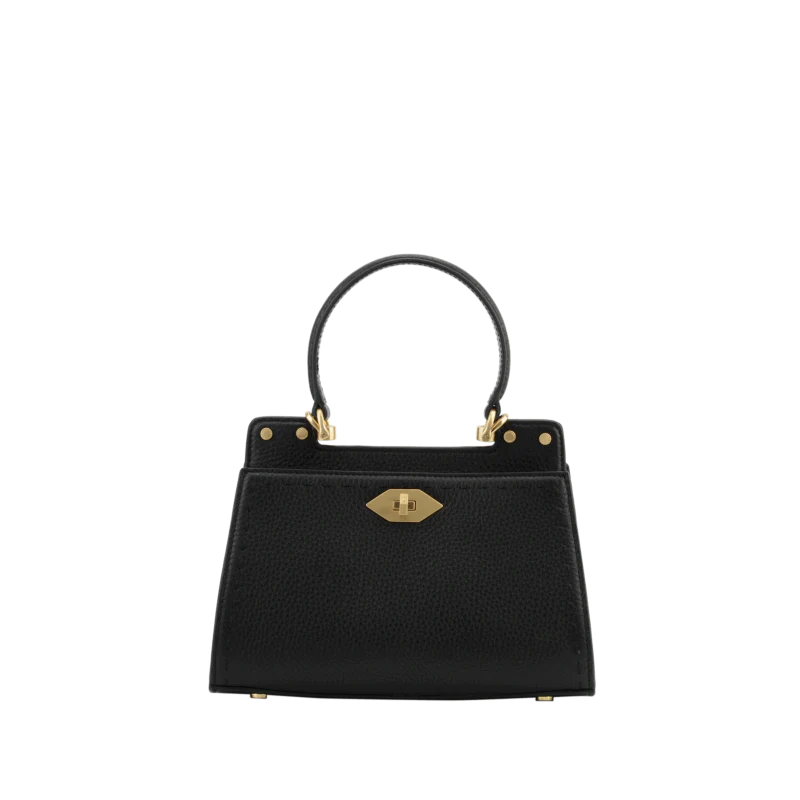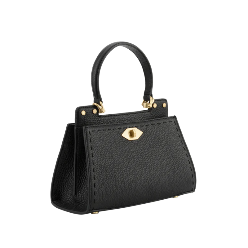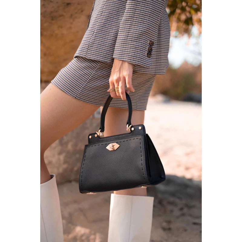 Le sac est orné de détails en métal doré, notamment une plaque avec le logo de la marque, ajoutant une touche de luxe à son design. Les coutures apparentes sur les bords soulignent l’artisanat de qualité, faisant de ce modèle un accessoire incontournable pour les femmes modernes.