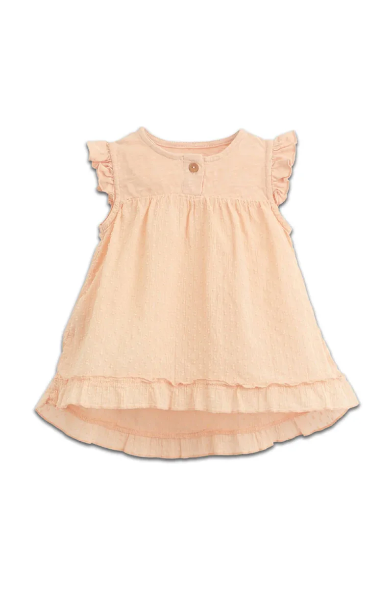 Cette tunique de couleur rose pale est faite d’un point de jersey en coton biologique et coton tissé. Le modèle a une encolure ronde et un volant sur les épaules et une ouverture sur le devant avec des petits boutons de bois. Le dos est un peu plus long. Toutes les matières premières utilisées dans cet article sont certifiées Standard 100 par OEKO-TEX, il est donc exempt de substances nocives pour la peau des bébés.