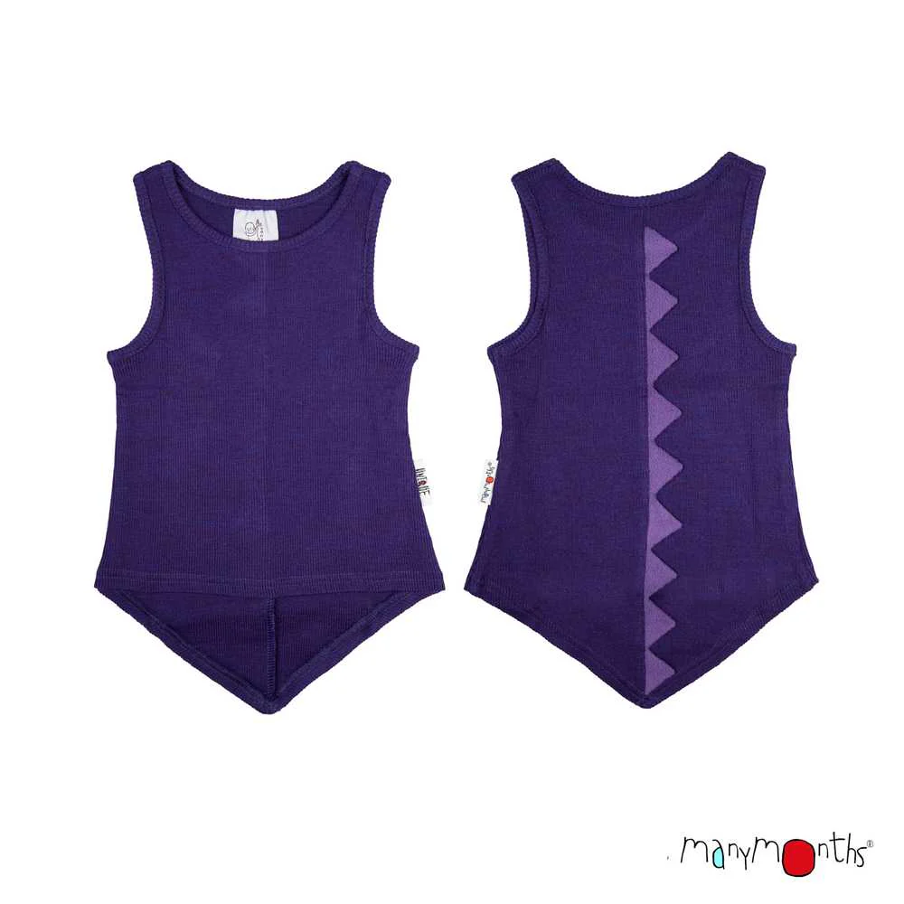 Un super débardeur Dinosaure en laine mérinos thermorégulatrice pour enfant, avec des écailles de dino (en polaire recyclée) sur le dos : pratique et original, il se superpose facilement et tient le haut du corps au chaud