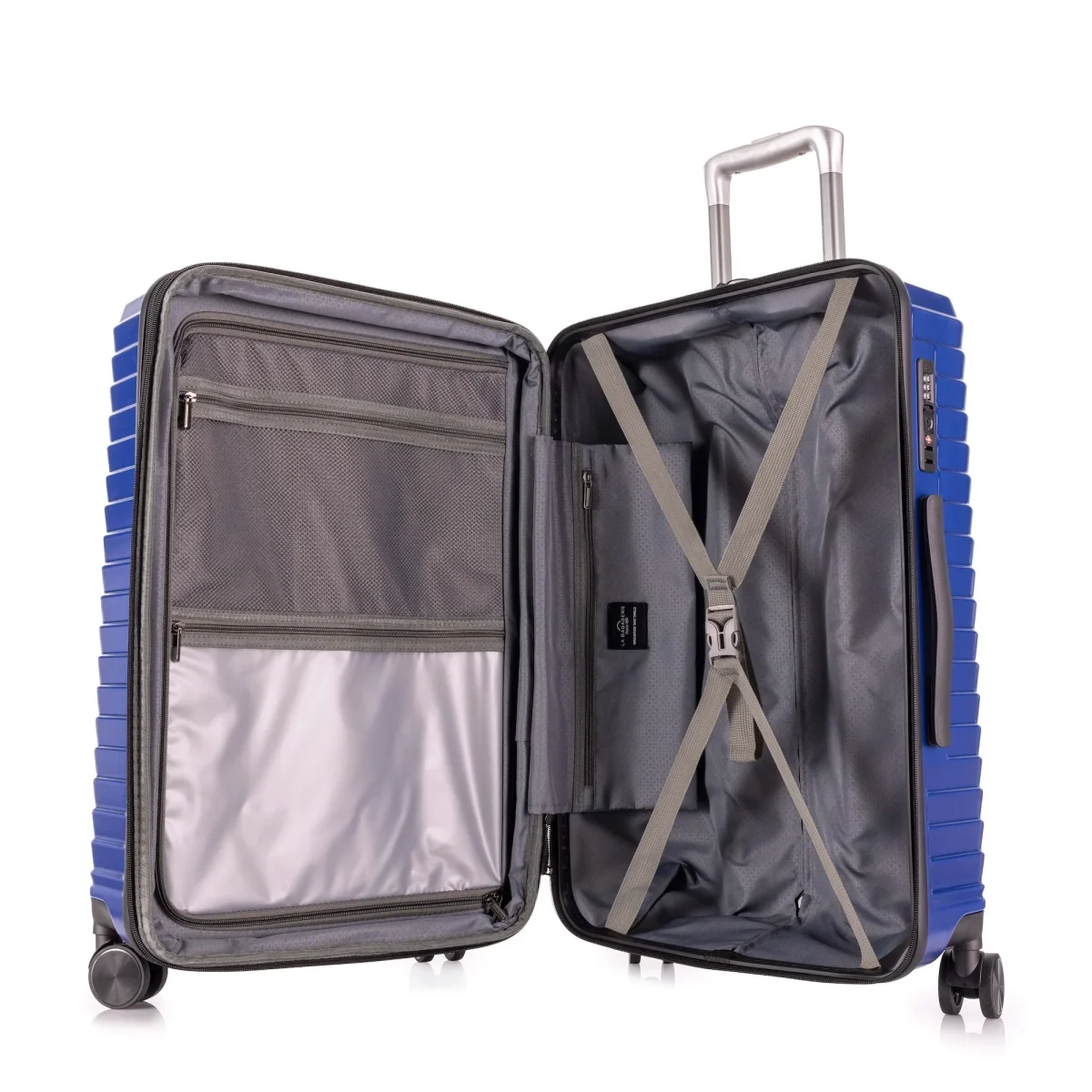 Voici notre Dream28 en bleu. Légère, pratique et solide voici une valise cabine idéale pour vos déplacements. Ses quatre double roues ultra-silencieuses apportent un réel confort. Ses fermetures éclair se bloquent dans une serrure à combinaison. Une fermeture TSA vous permettra de voyager aux USA en toute tranquillité même si vous devez enregistrer votre valise. Son intérieur est fonctionnel avec d’un coté un rabat qui ferme par un zip et deux grandes poches : l’une filet et l ‘autre plastifiée et de l ‘autre une sangle réglable et une poche zippée. Belle, stylée et super pratique , elle est prête à vous accompagner au bout du monde.