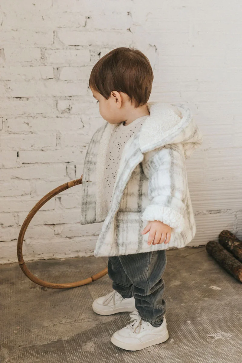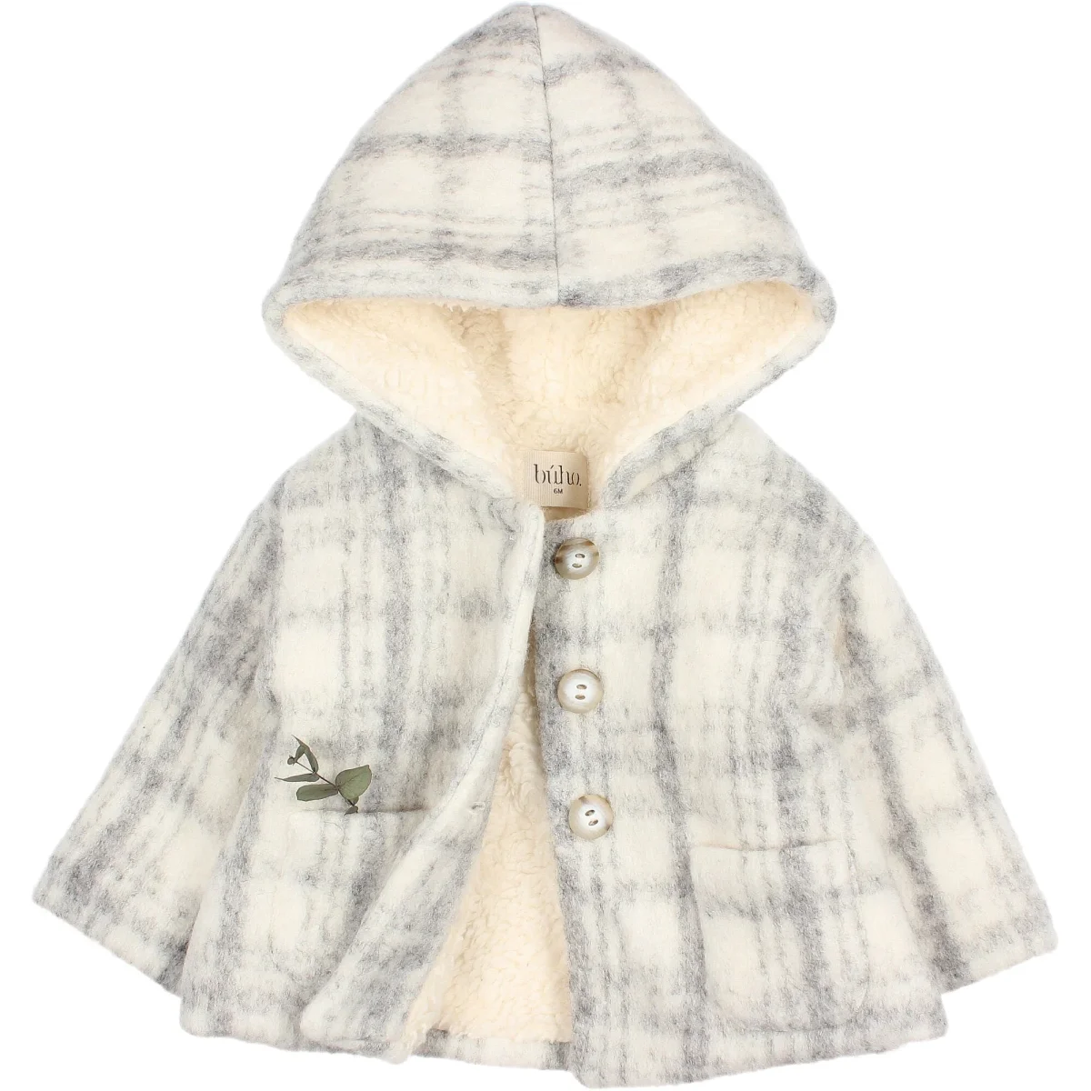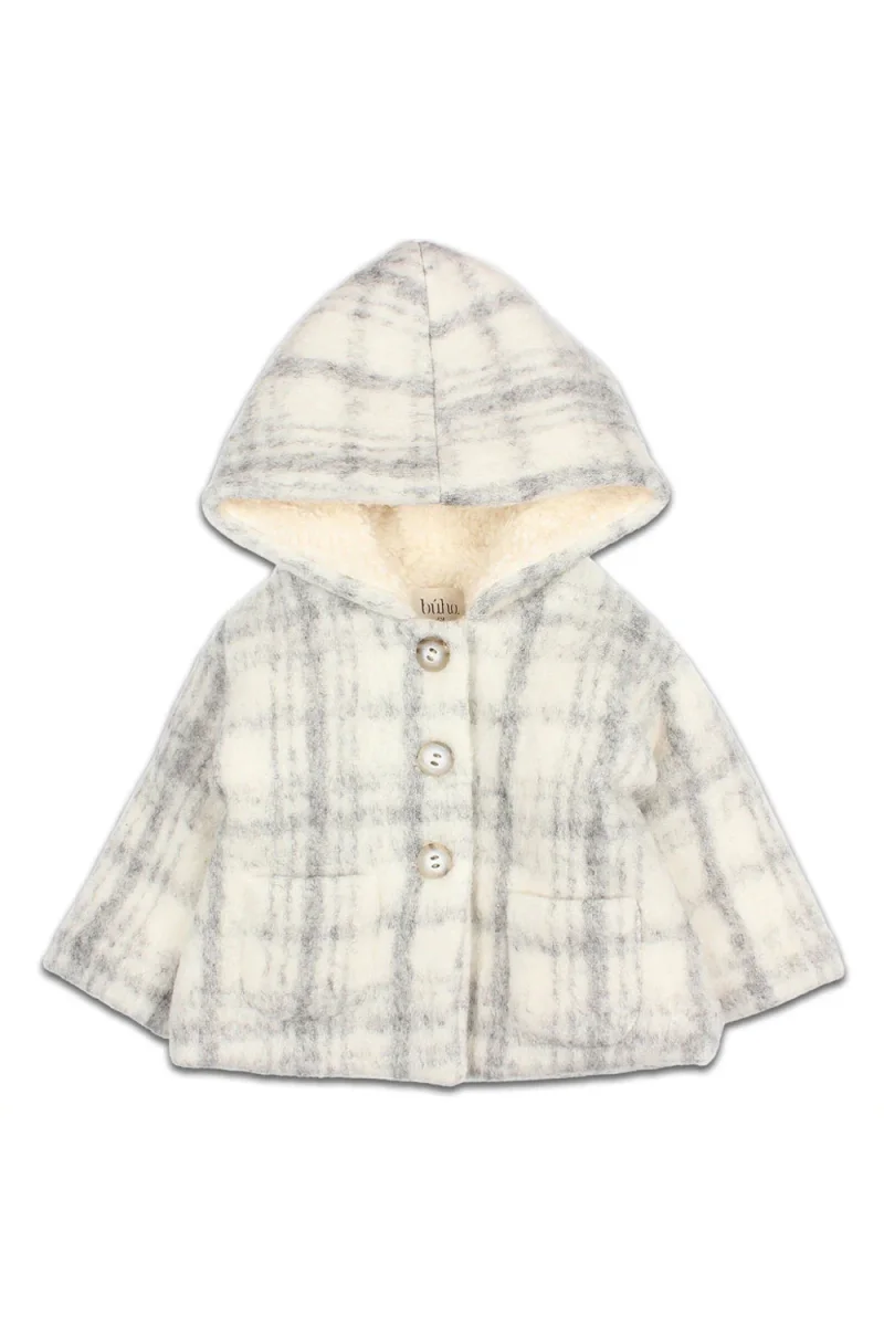 Veste en laine à carreaux avec capuche. Doublure en fourrure douce. Boutons à l’avant. Chaude et confortable.