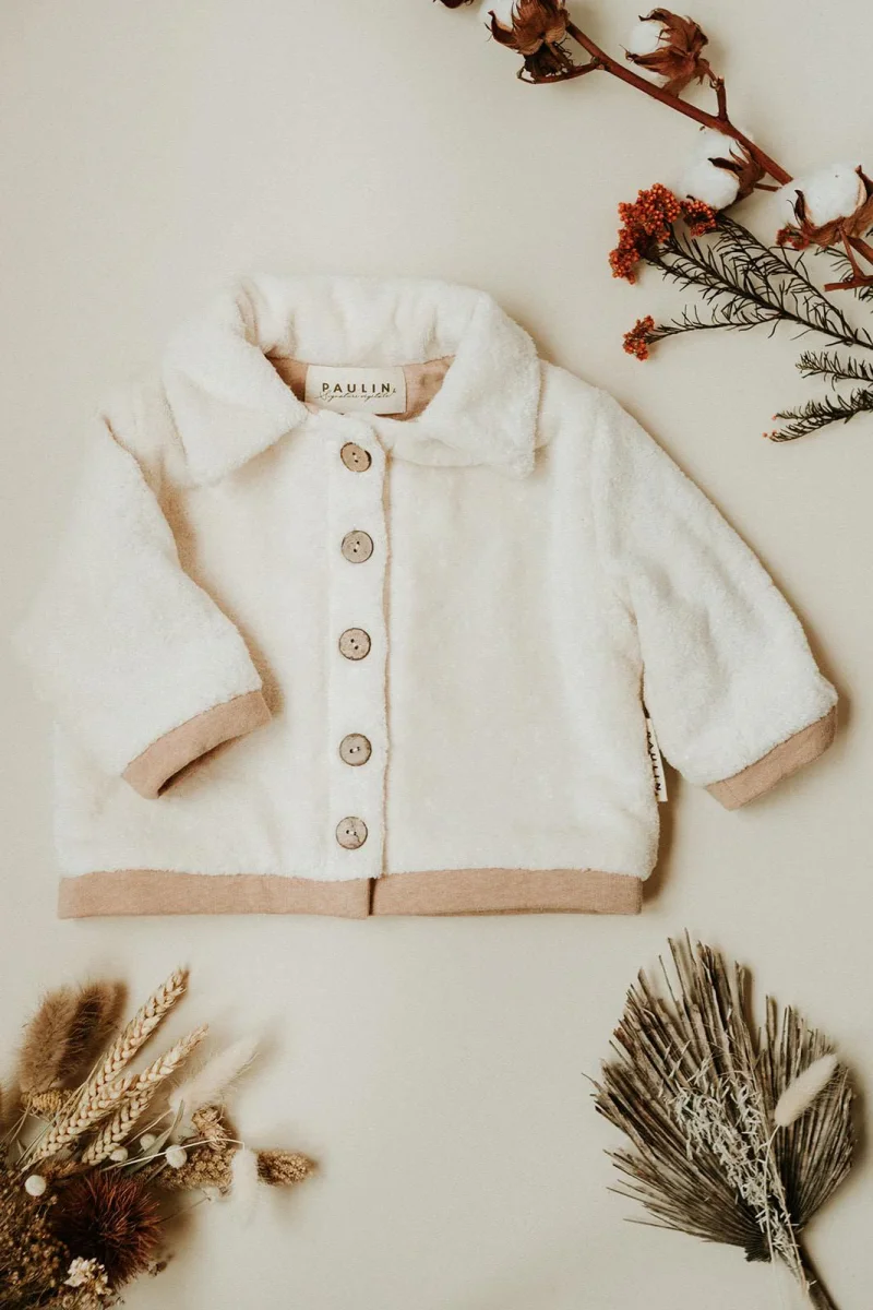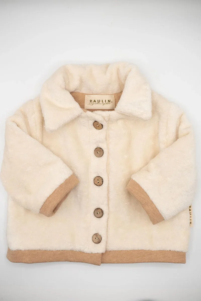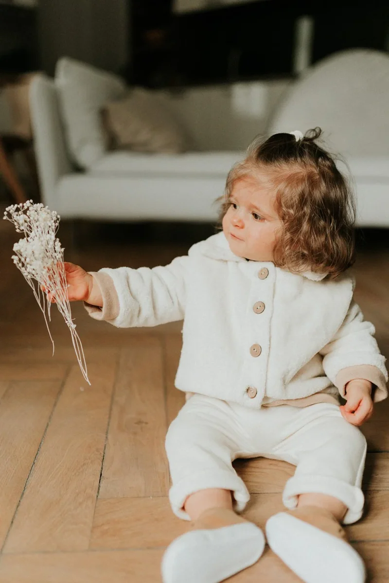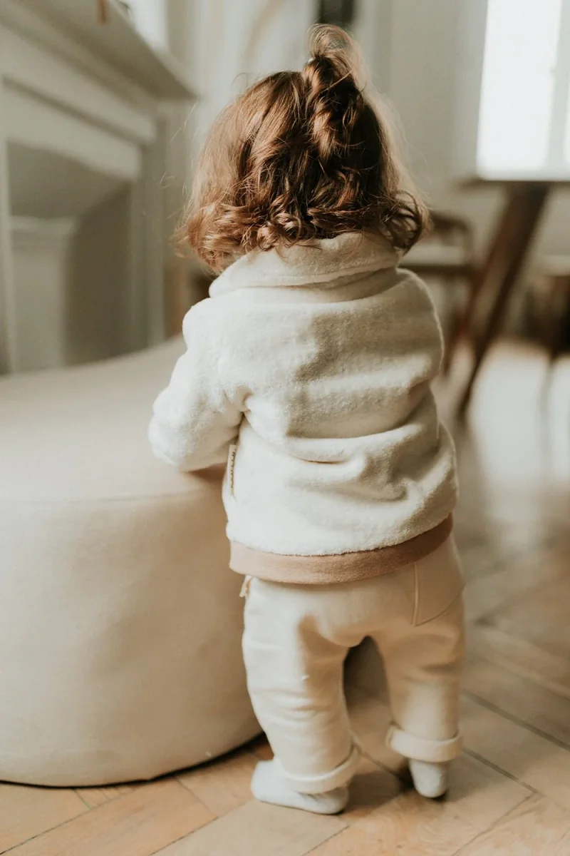 » Luison » c’est la parfaite veste de l’hiver pour bébé, elle est chaude, toute douce et très stylée avec son col légèrement aviateur elle est totalement mixte.Elle est en éponge de coton effet velours couleur crème et doublé en jersey de coton couleur noisette, les boutons sont en véritable noix de coco.Ce coton est biologique, certifié GOTS et ne contient aucune teinture, car la fibre de ce coton est naturellement colorée Créme ou Noisette.Cette gamme protège la peau fragile des tous petits et la planète car de la fibre à la couleur aucun produit chimique.Ce modèle s’associe parfaitement avec le pantalon « Gabin » et le sweat « Baudry » .