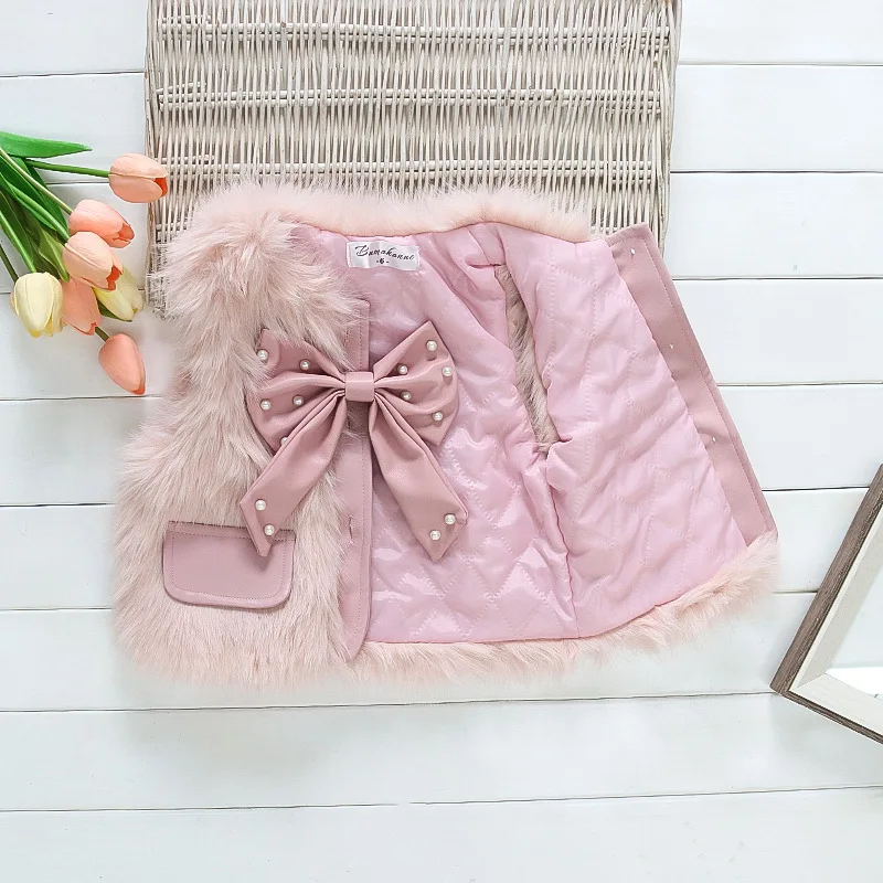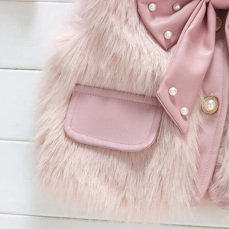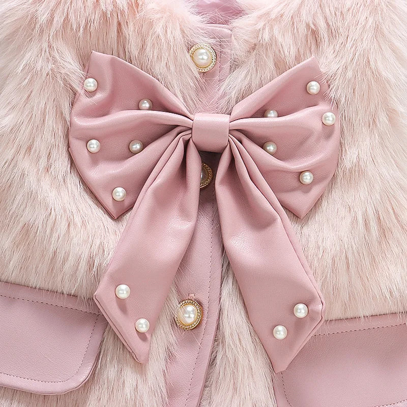 Gilet Fourrure Bébé avec Nœud et Perles – Rose