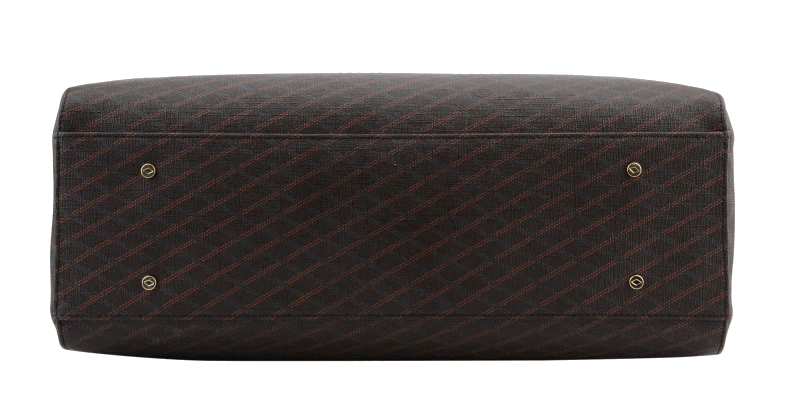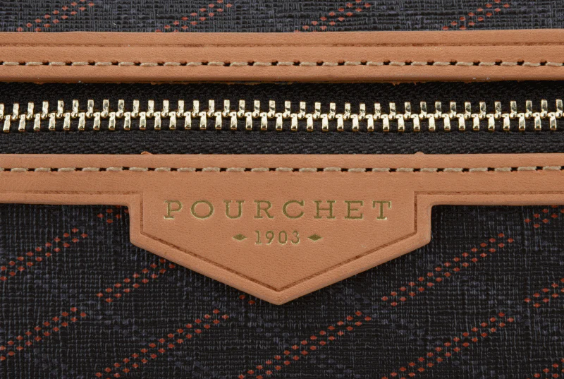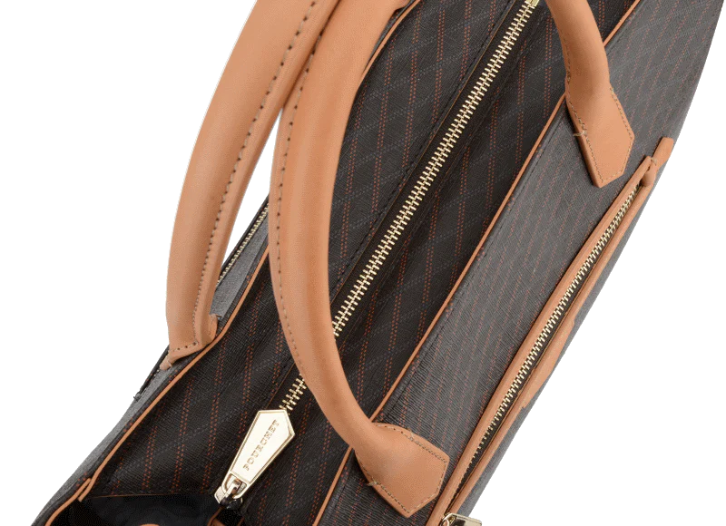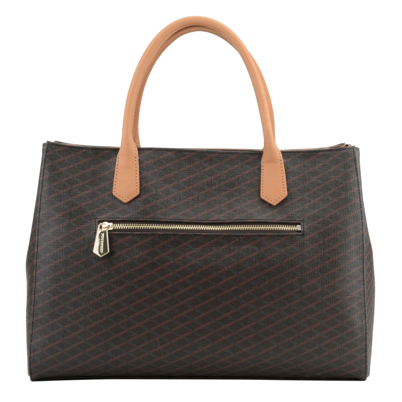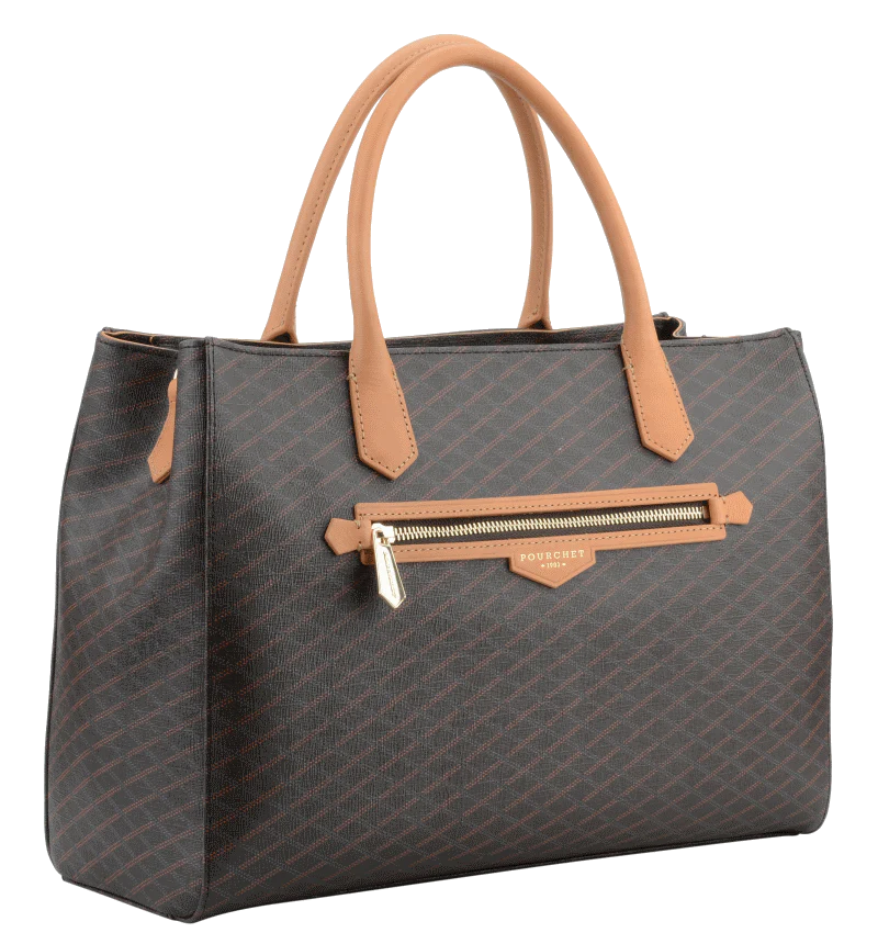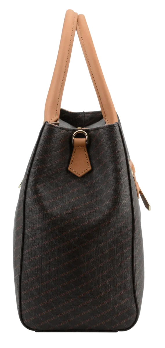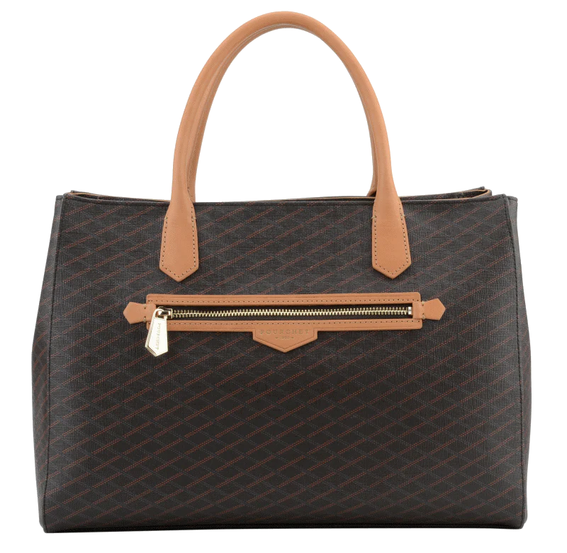 Graphique et généreux, ce sac joue l’élégance urbaine avec sa toile signature et ses poignées camel contrastées.