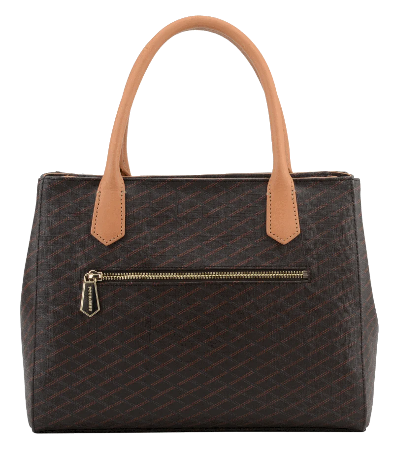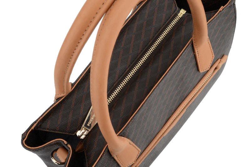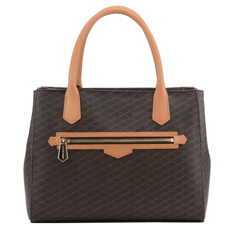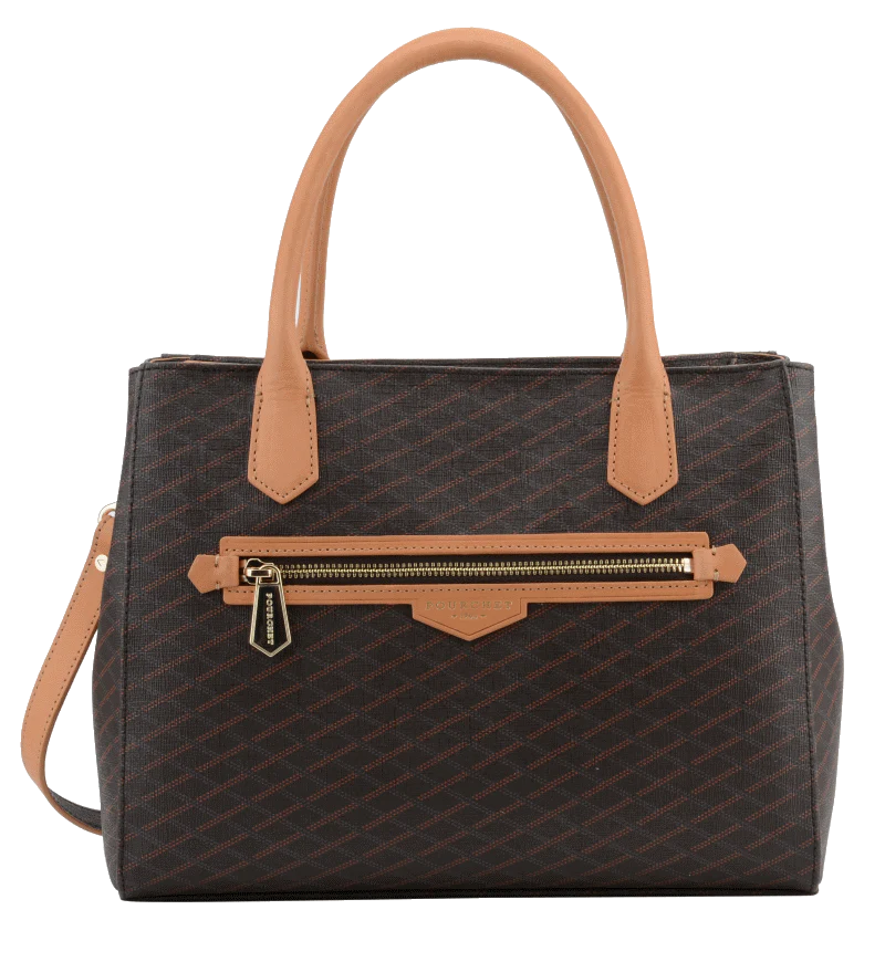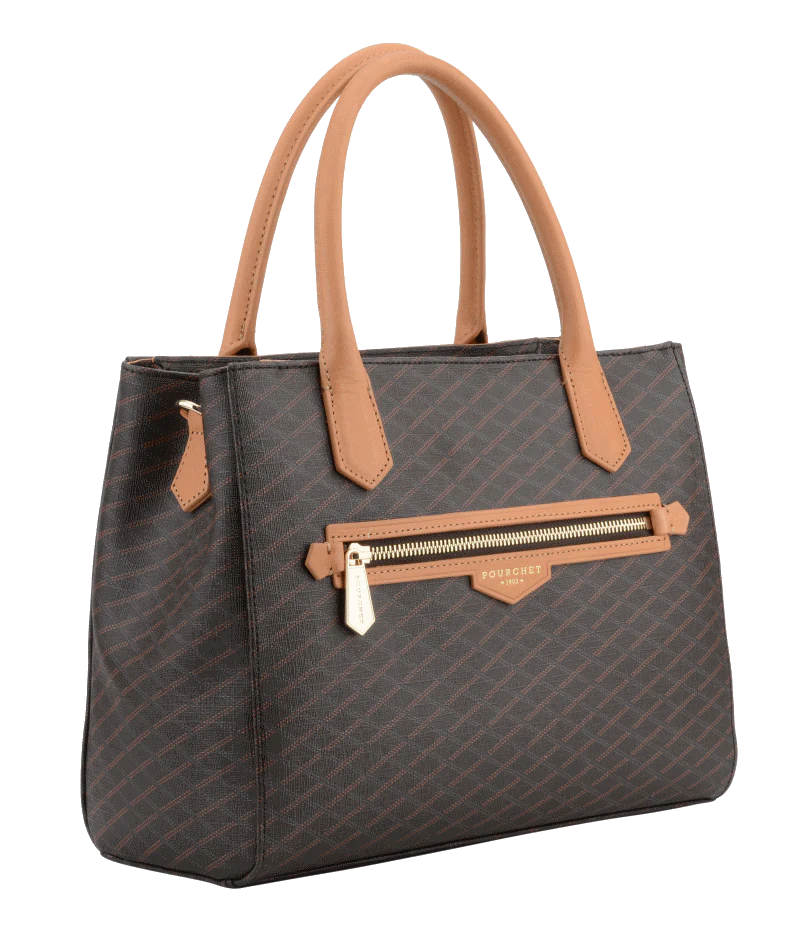 Graphique et généreux, ce sac joue l’élégance urbaine avec sa toile signature et ses poignées camel contrastées.