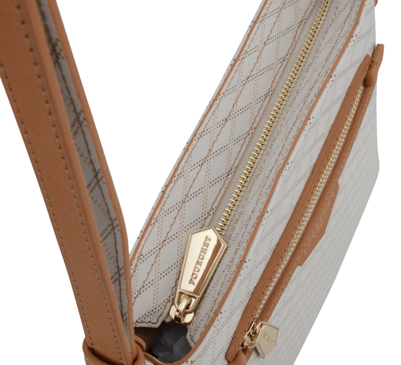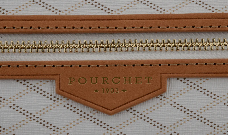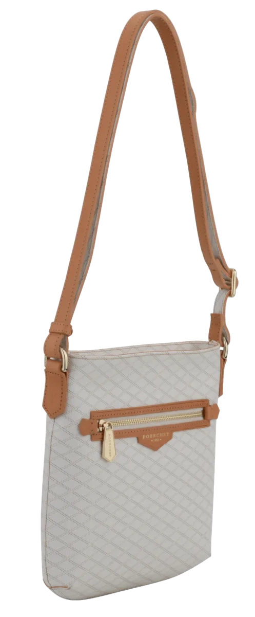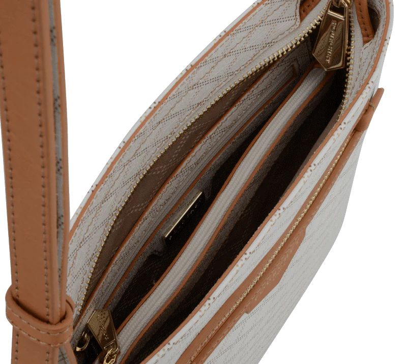 Un format plat, une bandoulière confortable, une toile monogrammée contrastée par des détails camel.