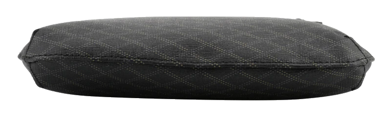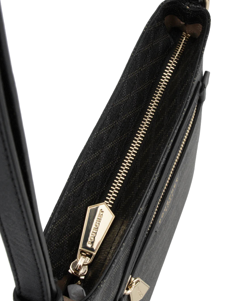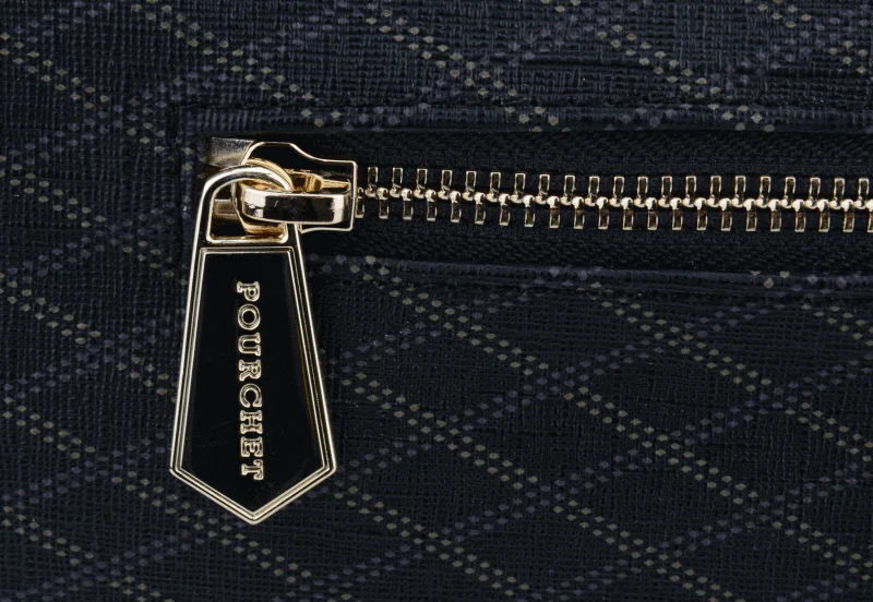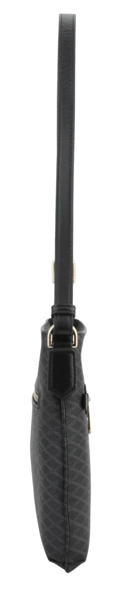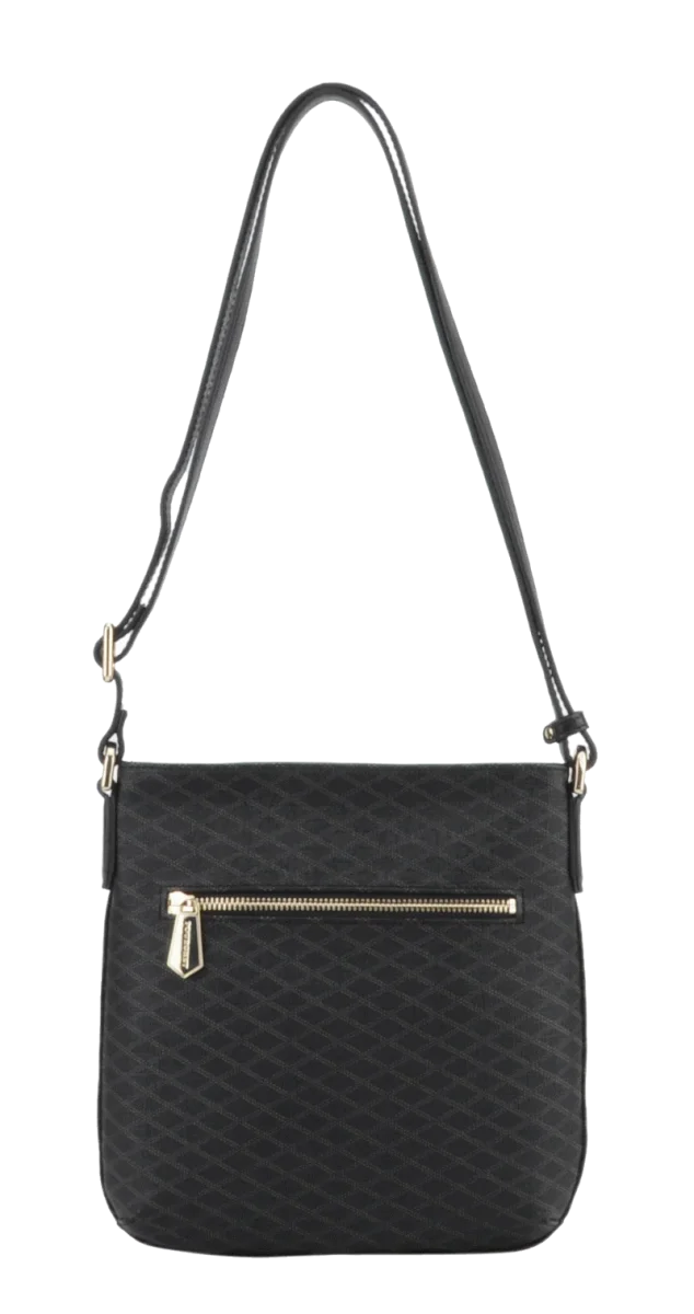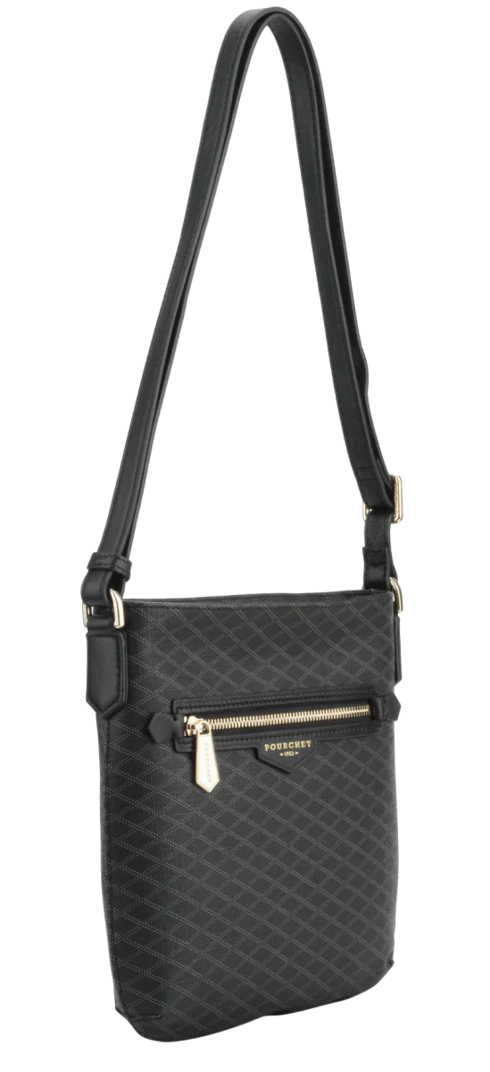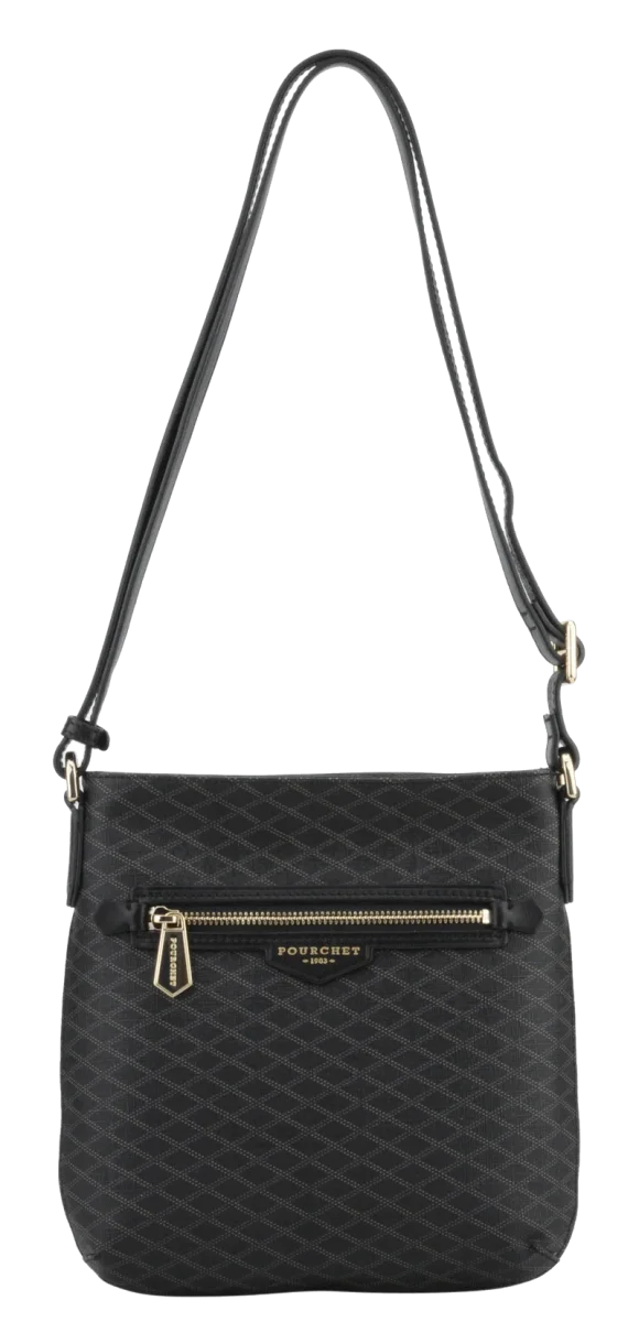 Un format plat, une bandoulière confortable, une toile monogrammée contrastée par des détails camel.