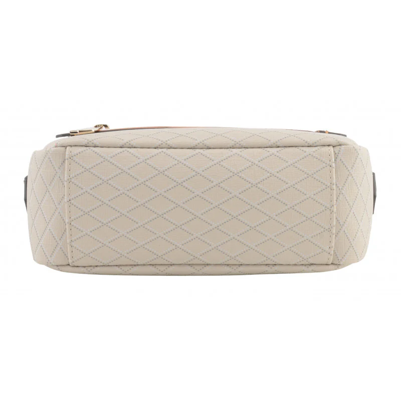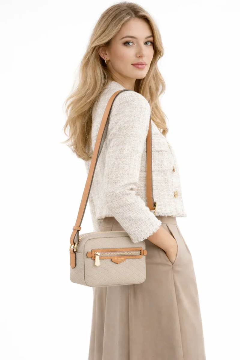 La bandoulière ajustable permet de porter le sac à la longueur souhaitée, offrant un confort optimal tout au long de la journée. Sa teinte taupe, agrémentée de détails en cuir caramel, en fait un choix polyvalent qui s’harmonise avec une multitude de tenues, qu’elles soient décontractées ou plus habillées.