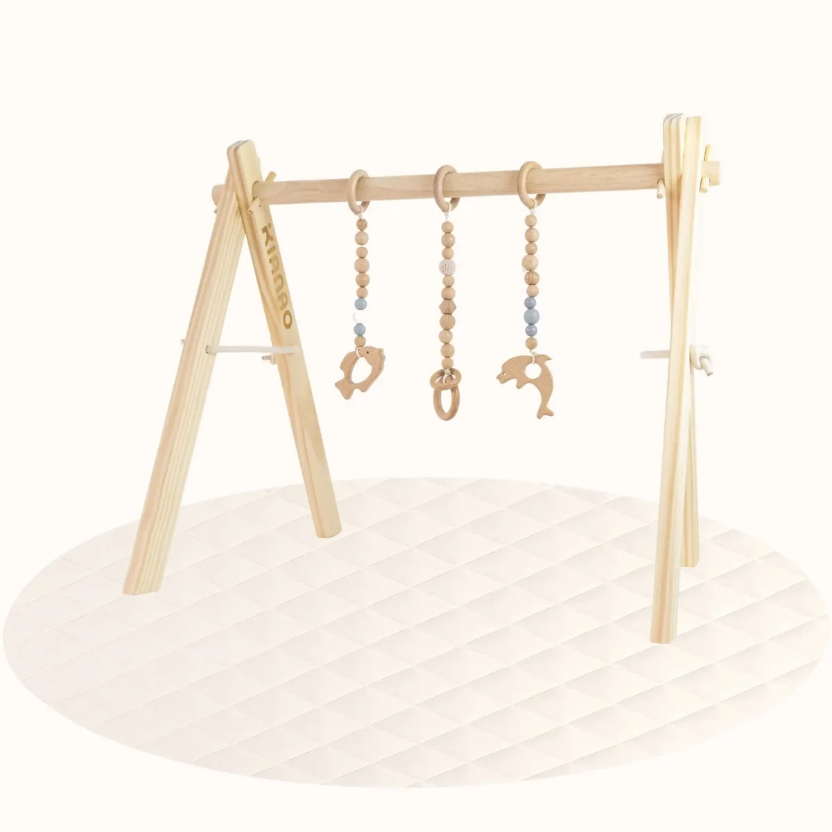 Our Fishs Play Gym Set transforms everyday playtime into an enriching sensory experience. Crafted from smooth, sustainably sourced wood, this minimalist A-frame design features specially designed wooden ring toys that invite your baby to reach, grasp, and explore. The natural wooden rings provide the perfect introduction to tactile play while developing crucial motor skills in a Montessori-inspired environment.