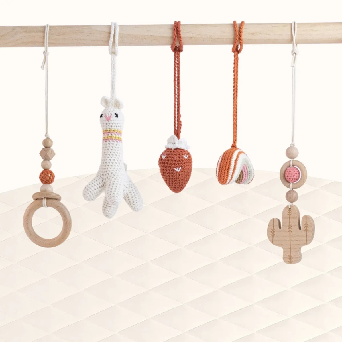 What makes the Lama with Strawberry Play Gym special? Our Lama with Strawberry Play Gym features a unique desert-inspired theme with handcrafted crochet toys. The combination of the friendly lama figure, textured strawberry, wooden cactus, and beaded elements creates a visually cohesive play space that stimulates multiple senses while maintaining a calming, earthy aesthetic perfect for mindful play.