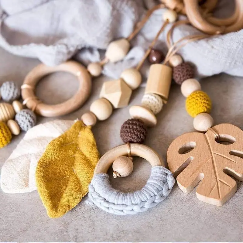 The thoughtfully balanced arrangement creates a harmonious visual rhythm above your baby, with each element offering different weights, movements, and tactile experiences. The smooth wooden leaf responds differently to touch than the soft fabric elements, while the beaded strands provide gentle sound feedback as they connect. This variety creates a complete sensory landscape that grows with your baby from visual exploration to active manipulation.