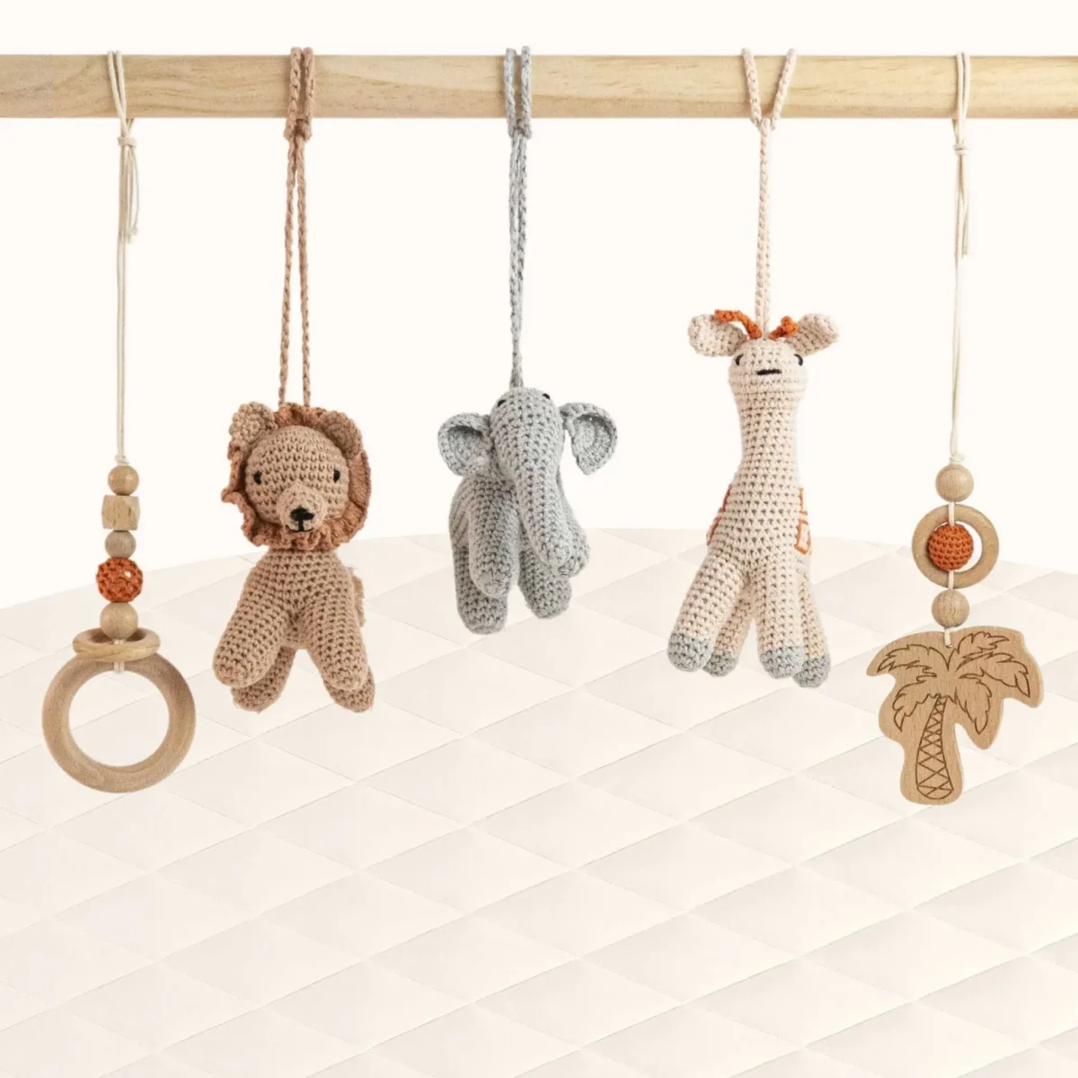 Our Wild Jungle Play Gym Set transforms playtime into a safari adventure with its collection of charming animal friends. The natural wooden A-frame creates the perfect setting for the crocheted lion, elephant, and giraffe to dangle alongside a wooden palm tree and beaded ring toy. Each handcrafted element invites your baby to reach, grasp, and embark on their earliest adventures in the comfort of your home.